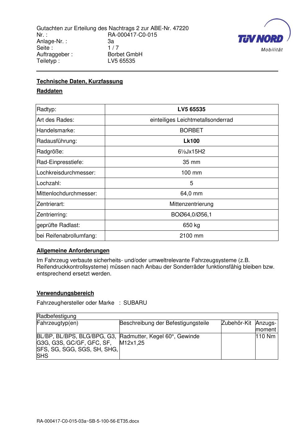 Dieses Gutachten (abe) bezieht sich auf die Alufelge brand-borbet LV5 65535 in der Ausführung ET 0, Mittenloch 0 mm (KBA 47220). Im PDF findest du typischerweise zulässige Reifengrößen, Auflagen/Anbauhinweise und – je nach Dokument – Hinweise zur Eintragung.