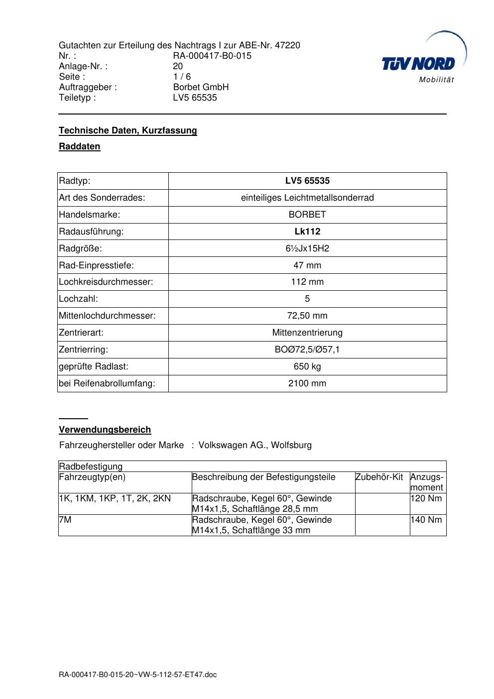 Dieses Gutachten (abe) bezieht sich auf die Alufelge brand-borbet LV5 65535 in der Ausführung ET 0, Mittenloch 0 mm (KBA 47220). Im PDF findest du typischerweise zulässige Reifengrößen, Auflagen/Anbauhinweise und – je nach Dokument – Hinweise zur Eintragung.