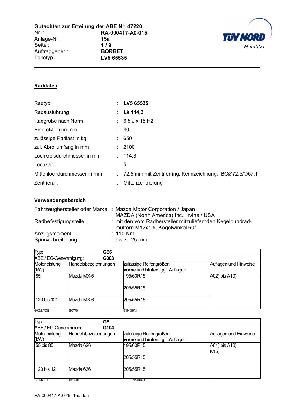 Dieses Gutachten (abe) bezieht sich auf die Alufelge Borbet LV5 65535 in der Ausführung 6.5Jx15 ET 0, Mittenloch 0 mm (KBA 47220). Im PDF findest du typischerweise zulässige Reifengrößen, Auflagen/Anbauhinweise und – je nach Dokument – Hinweise zur Eintragung.