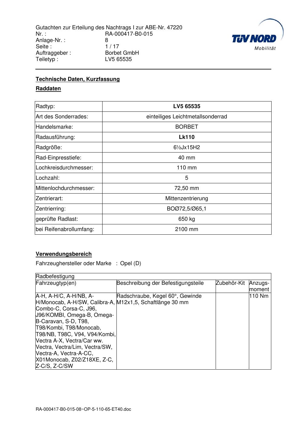 Dieses Gutachten (abe) bezieht sich auf die Alufelge brand-borbet LV5 65535 in der Ausführung ET 0, Mittenloch 0 mm (KBA 47220). Im PDF findest du typischerweise zulässige Reifengrößen, Auflagen/Anbauhinweise und – je nach Dokument – Hinweise zur Eintragung.