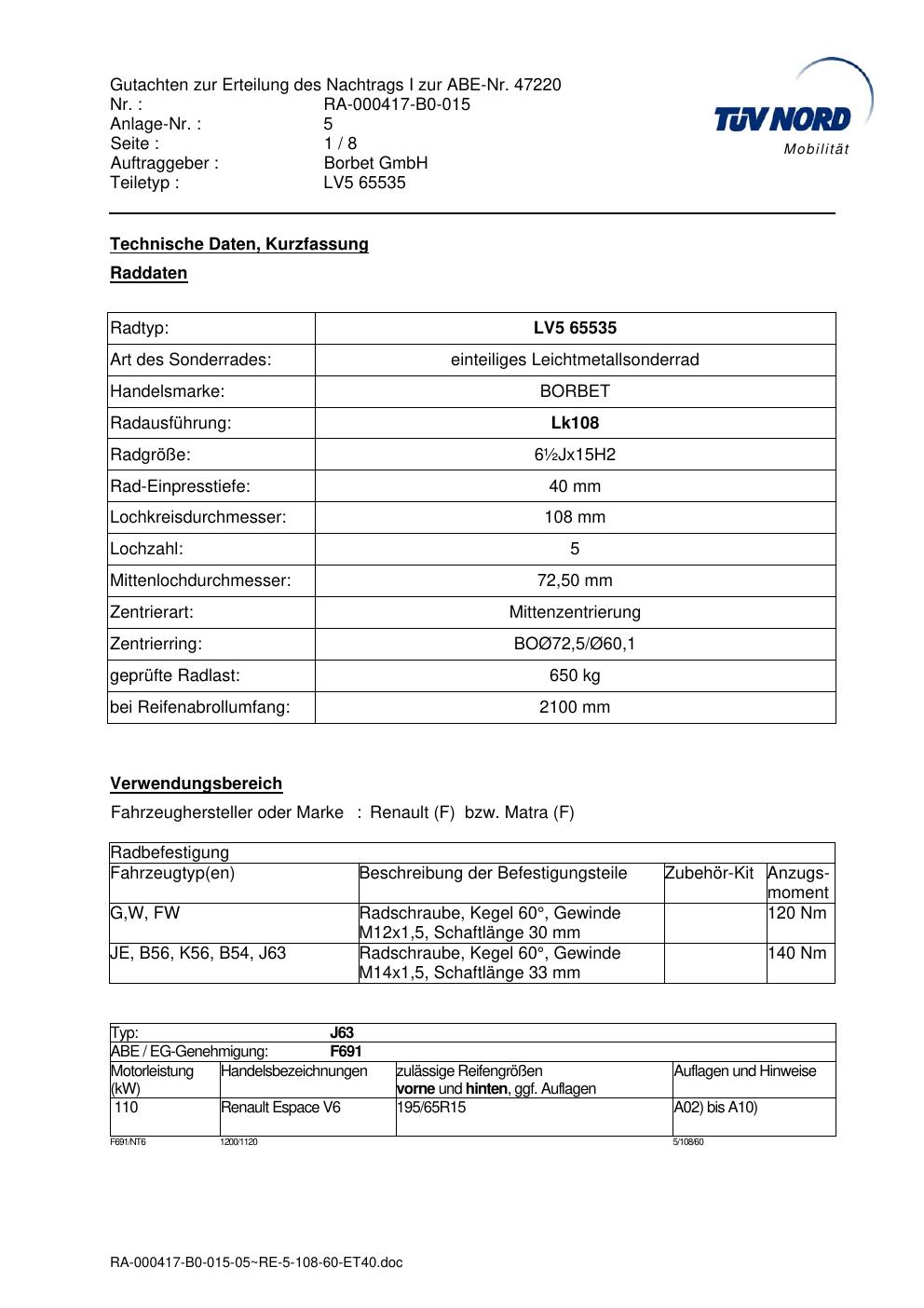 Dieses Gutachten (abe) bezieht sich auf die Alufelge brand-borbet LV5 65535 in der Ausführung ET 0, Mittenloch 0 mm (KBA 47220). Im PDF findest du typischerweise zulässige Reifengrößen, Auflagen/Anbauhinweise und – je nach Dokument – Hinweise zur Eintragung.