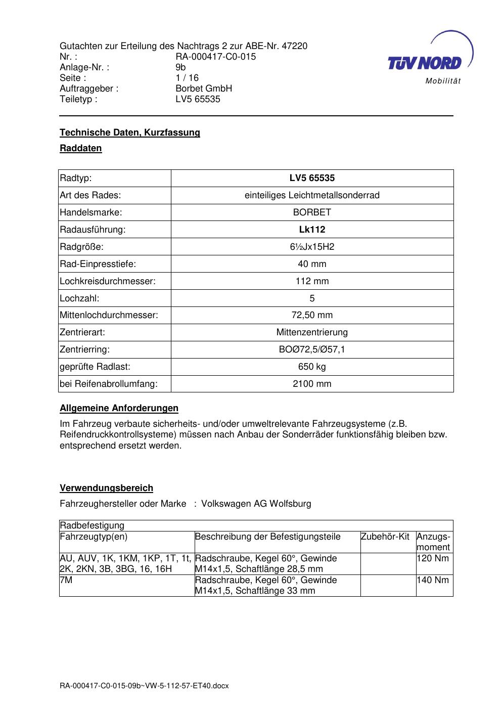 Dieses Gutachten (abe) bezieht sich auf die Alufelge brand-borbet LV5 65535 in der Ausführung ET 0, Mittenloch 0 mm (KBA 47220). Im PDF findest du typischerweise zulässige Reifengrößen, Auflagen/Anbauhinweise und – je nach Dokument – Hinweise zur Eintragung.