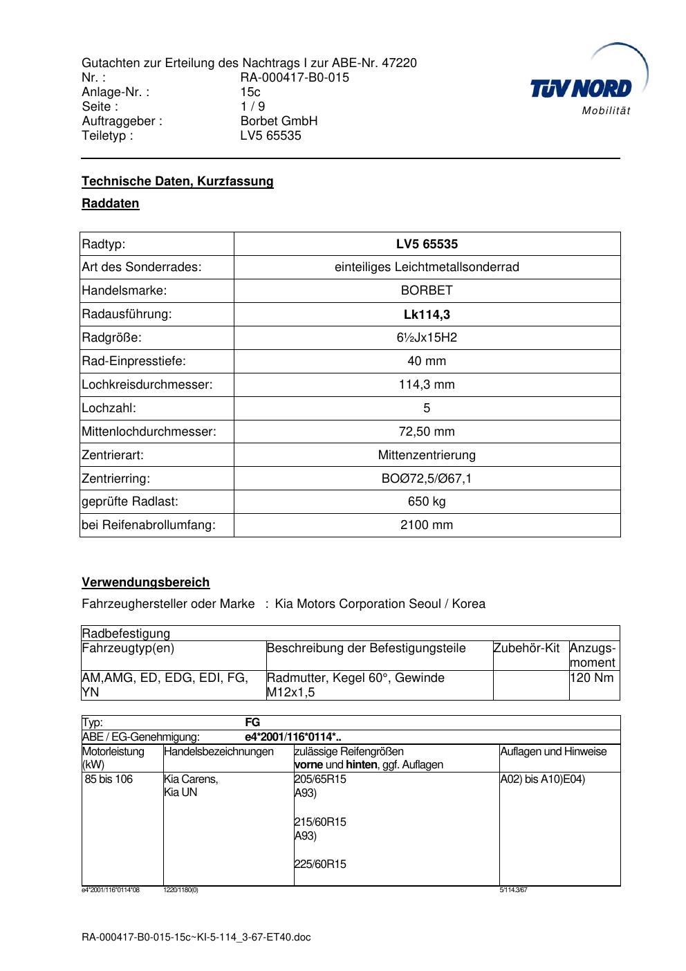 Dieses Gutachten (abe) bezieht sich auf die Alufelge brand-borbet LV5 65535 in der Ausführung ET 0, Mittenloch 0 mm (KBA 47220). Im PDF findest du typischerweise zulässige Reifengrößen, Auflagen/Anbauhinweise und – je nach Dokument – Hinweise zur Eintragung.
