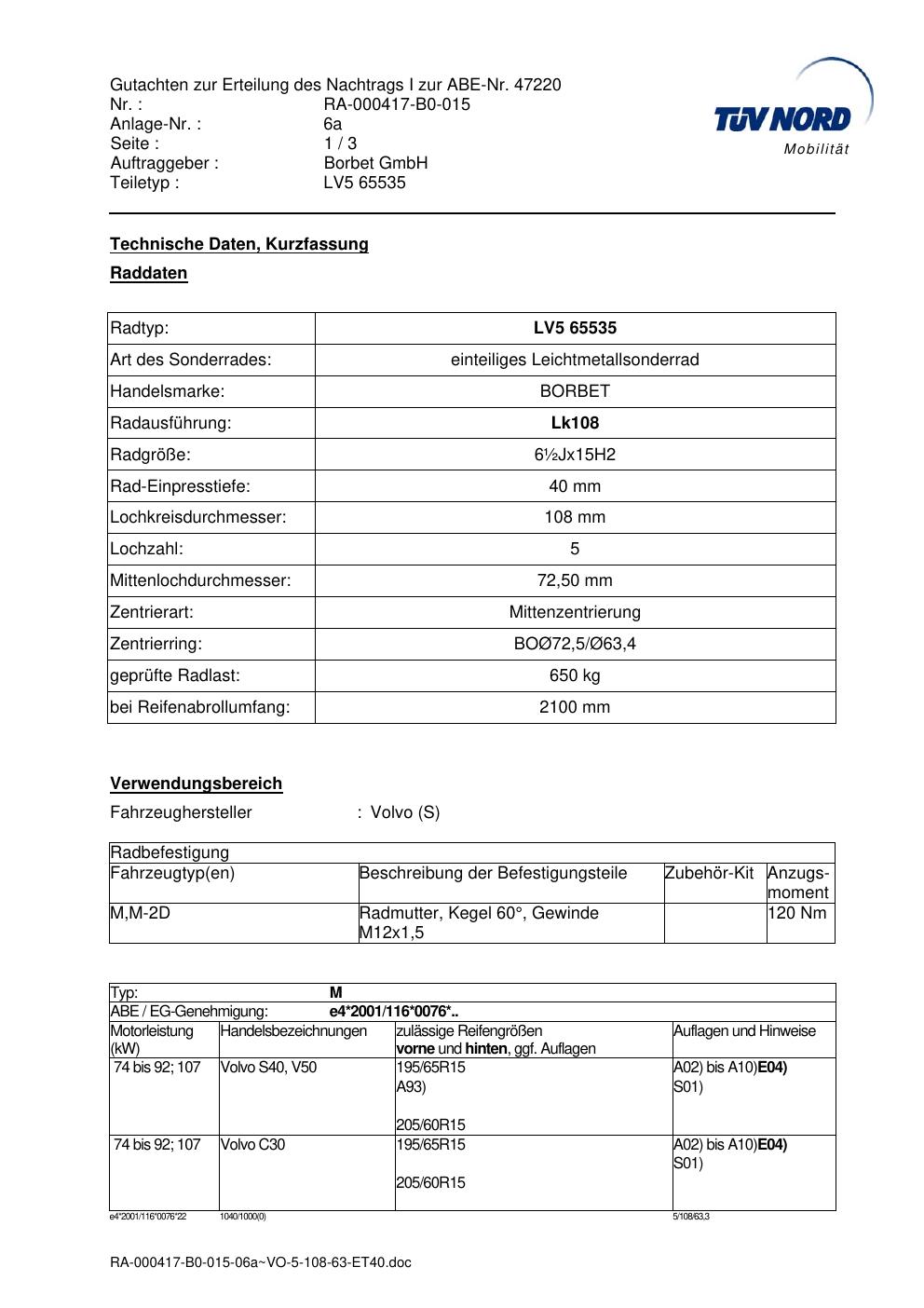 Dieses Gutachten (abe) bezieht sich auf die Alufelge brand-borbet LV5 65535 in der Ausführung ET 0, Mittenloch 0 mm (KBA 47220). Im PDF findest du typischerweise zulässige Reifengrößen, Auflagen/Anbauhinweise und – je nach Dokument – Hinweise zur Eintragung.