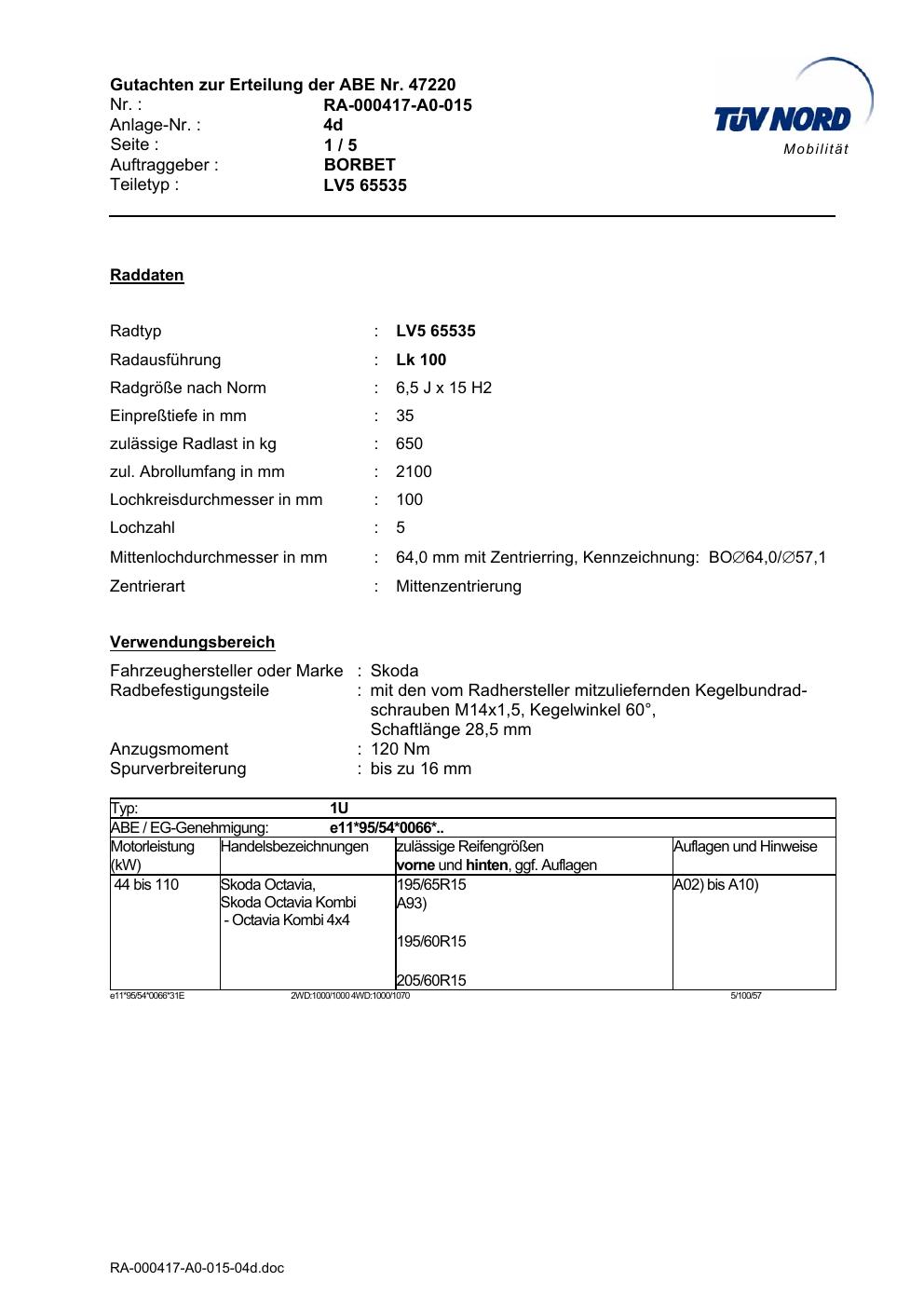 Dieses Gutachten (abe) bezieht sich auf die Alufelge Borbet LV5 65535 in der Ausführung 6.5Jx15 ET 0, Mittenloch 0 mm (KBA 47220). Im PDF findest du typischerweise zulässige Reifengrößen, Auflagen/Anbauhinweise und – je nach Dokument – Hinweise zur Eintragung.