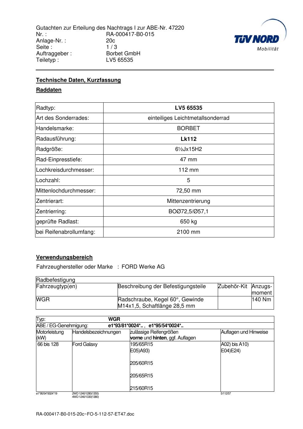 Dieses Gutachten (abe) bezieht sich auf die Alufelge brand-borbet LV5 65535 in der Ausführung ET 0, Mittenloch 0 mm (KBA 47220). Im PDF findest du typischerweise zulässige Reifengrößen, Auflagen/Anbauhinweise und – je nach Dokument – Hinweise zur Eintragung.
