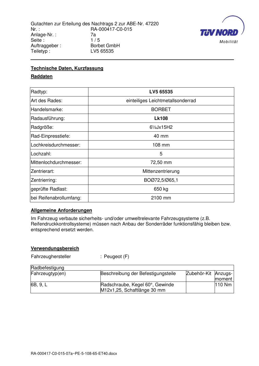 Dieses Gutachten (abe) bezieht sich auf die Alufelge brand-borbet LV5 65535 in der Ausführung ET 0, Mittenloch 0 mm (KBA 47220). Im PDF findest du typischerweise zulässige Reifengrößen, Auflagen/Anbauhinweise und – je nach Dokument – Hinweise zur Eintragung.