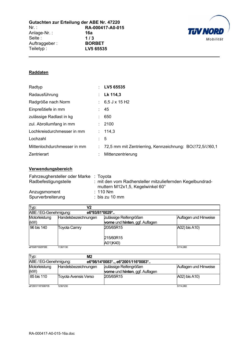 Dieses Gutachten (abe) bezieht sich auf die Alufelge Borbet LV5 65535 in der Ausführung 6.5Jx15 ET 0, Mittenloch 0 mm (KBA 47220). Im PDF findest du typischerweise zulässige Reifengrößen, Auflagen/Anbauhinweise und – je nach Dokument – Hinweise zur Eintragung.
