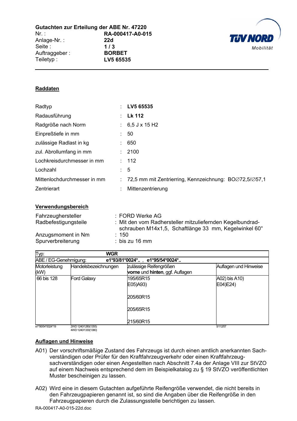 Dieses Gutachten (abe) bezieht sich auf die Alufelge Borbet LV5 65535 in der Ausführung 6.5Jx15 ET 0, Mittenloch 0 mm (KBA 47220). Im PDF findest du typischerweise zulässige Reifengrößen, Auflagen/Anbauhinweise und – je nach Dokument – Hinweise zur Eintragung.