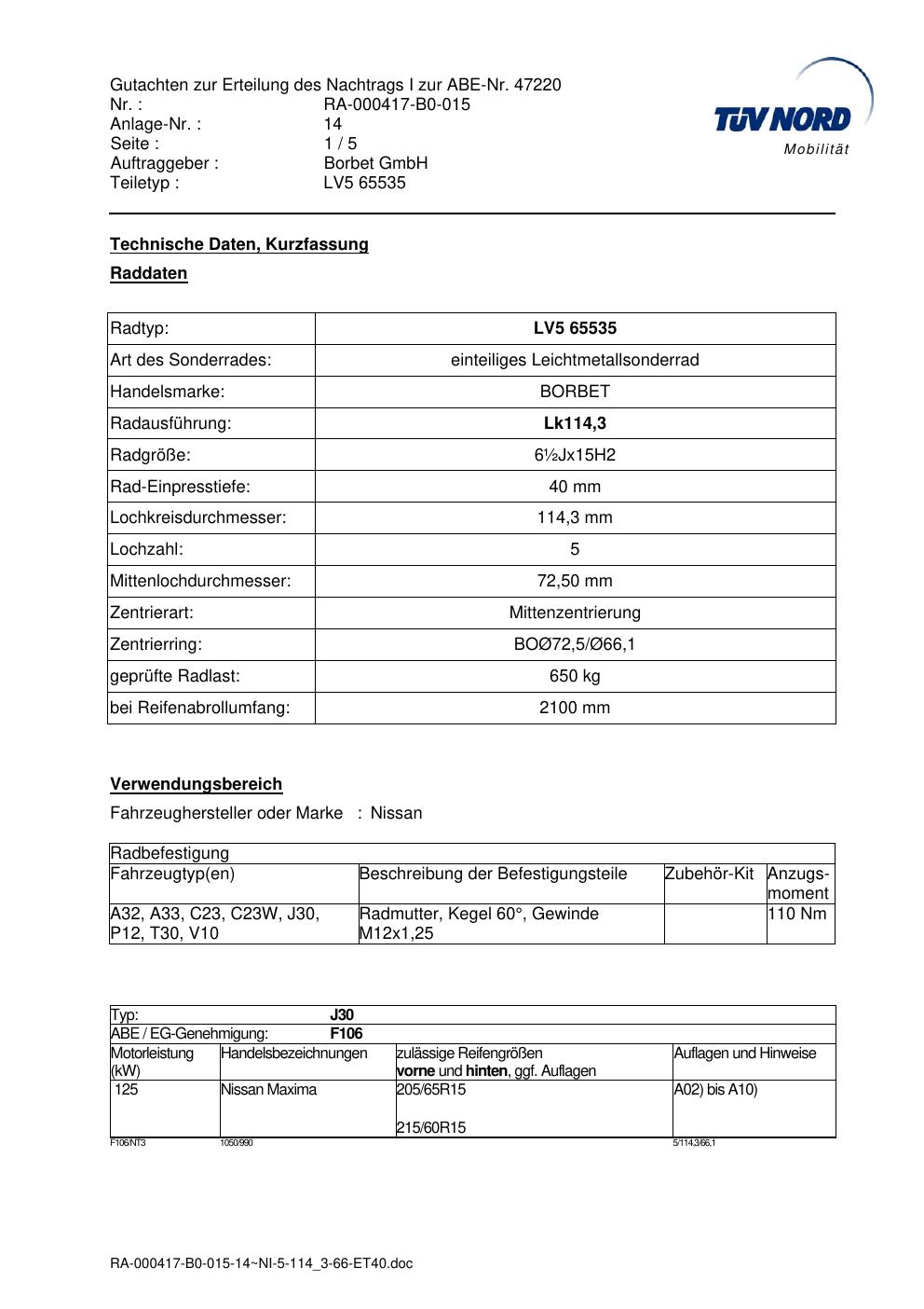 Dieses Gutachten (abe) bezieht sich auf die Alufelge brand-borbet LV5 65535 in der Ausführung ET 0, Mittenloch 0 mm (KBA 47220). Im PDF findest du typischerweise zulässige Reifengrößen, Auflagen/Anbauhinweise und – je nach Dokument – Hinweise zur Eintragung.