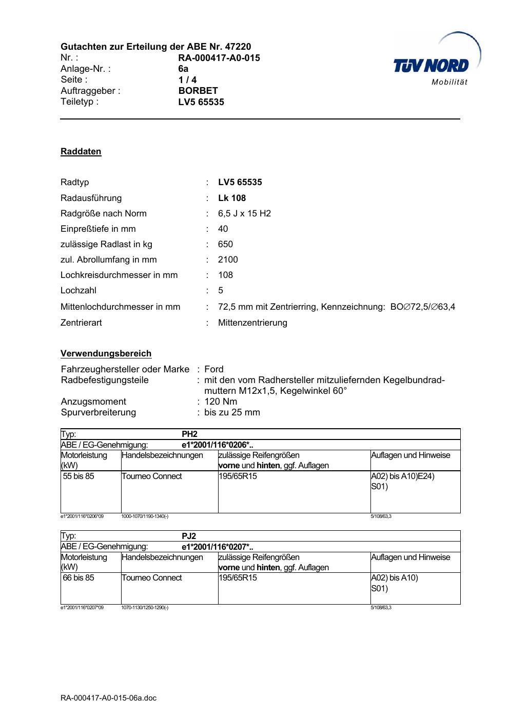 Dieses Gutachten (abe) bezieht sich auf die Alufelge Borbet LV5 65535 in der Ausführung 6.5Jx15 ET 0, Mittenloch 0 mm (KBA 47220). Im PDF findest du typischerweise zulässige Reifengrößen, Auflagen/Anbauhinweise und – je nach Dokument – Hinweise zur Eintragung.