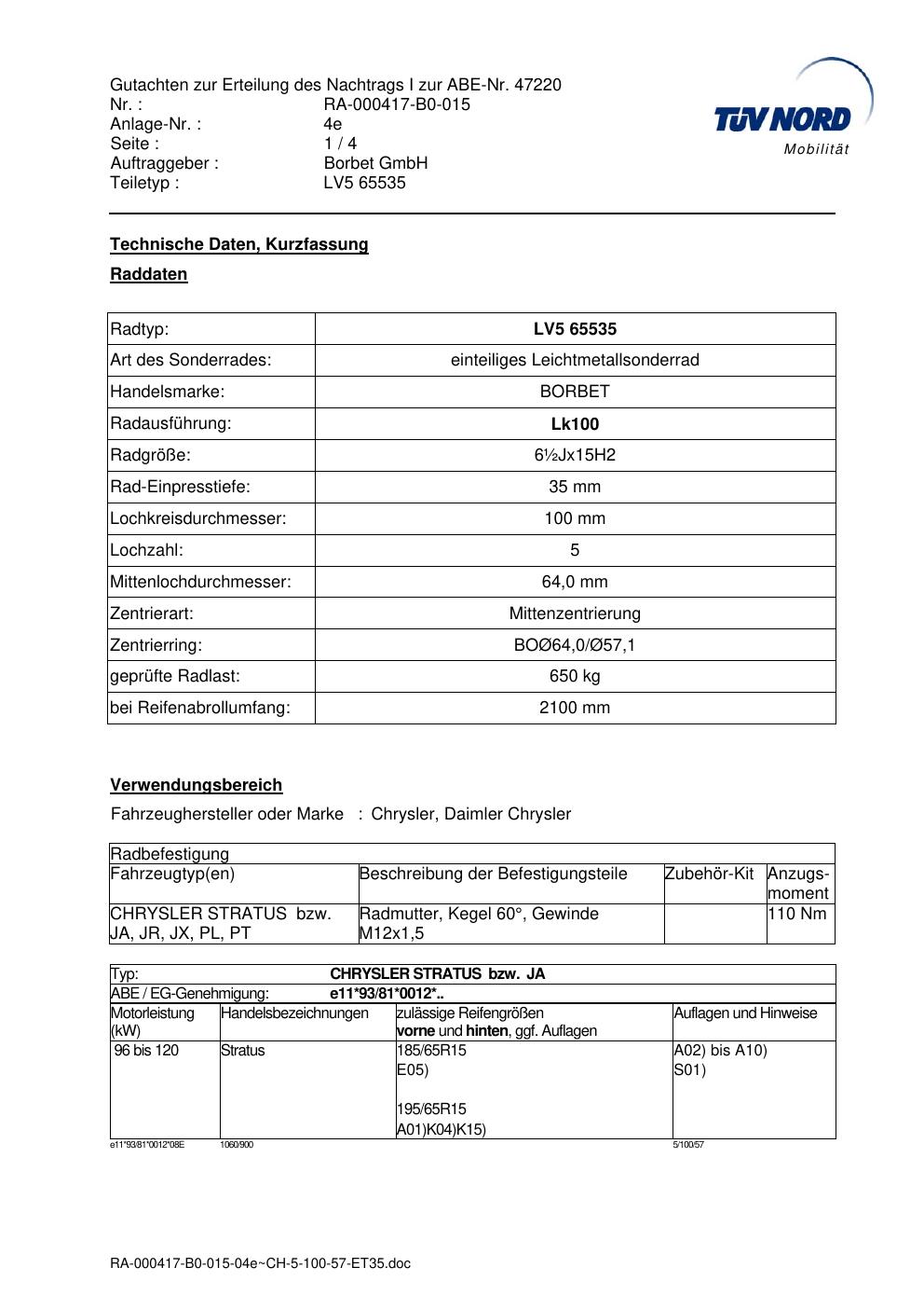 Dieses Gutachten (abe) bezieht sich auf die Alufelge brand-borbet LV5 65535 in der Ausführung ET 0, Mittenloch 0 mm (KBA 47220). Im PDF findest du typischerweise zulässige Reifengrößen, Auflagen/Anbauhinweise und – je nach Dokument – Hinweise zur Eintragung.
