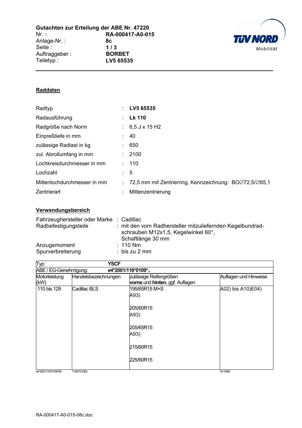 Dieses Gutachten (abe) bezieht sich auf die Alufelge Borbet LV5 65535 in der Ausführung 6.5Jx15 ET 0, Mittenloch 0 mm (KBA 47220). Im PDF findest du typischerweise zulässige Reifengrößen, Auflagen/Anbauhinweise und – je nach Dokument – Hinweise zur Eintragung.