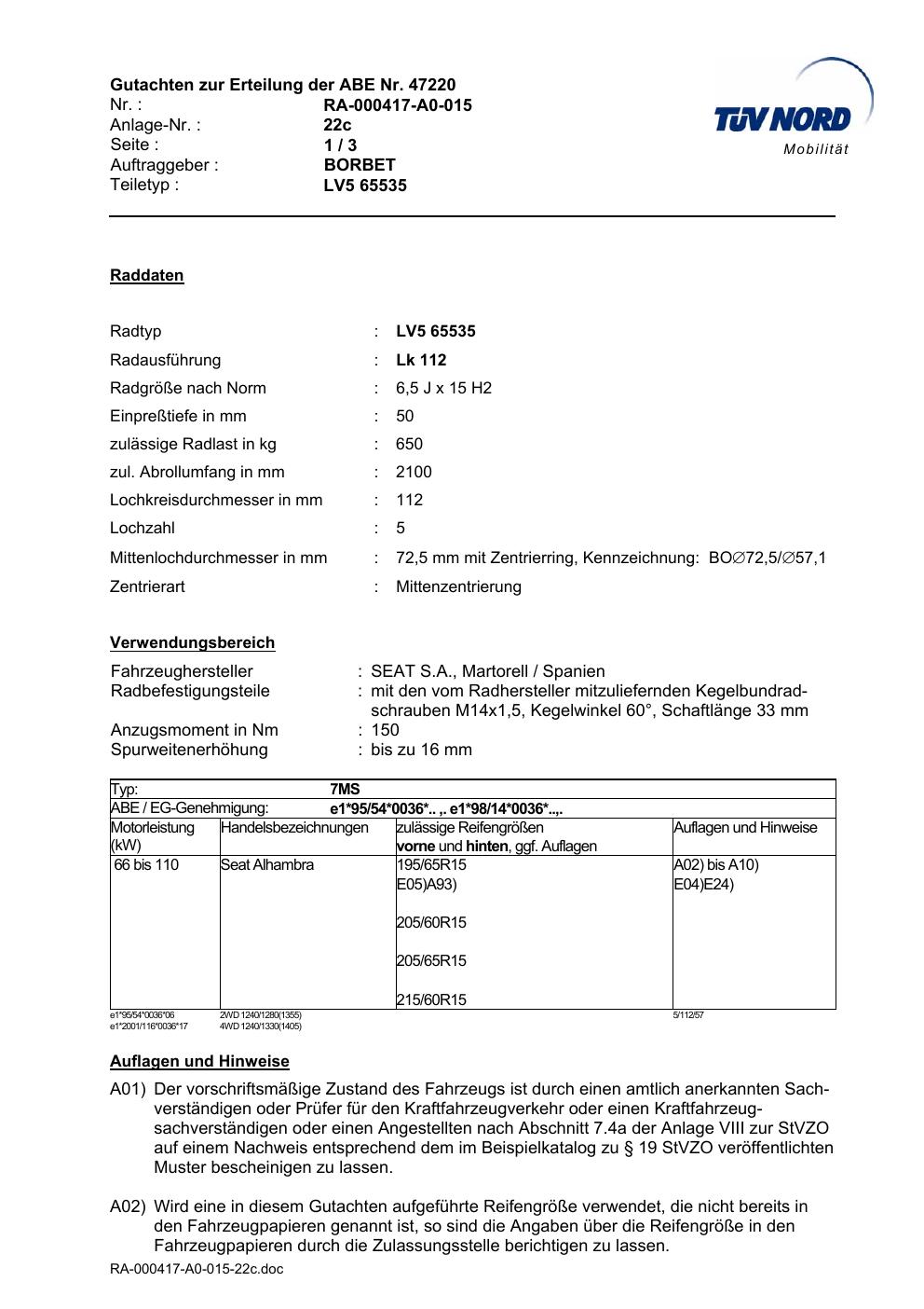 Dieses Gutachten (abe) bezieht sich auf die Alufelge Borbet LV5 65535 in der Ausführung 6.5Jx15 ET 0, Mittenloch 0 mm (KBA 47220). Im PDF findest du typischerweise zulässige Reifengrößen, Auflagen/Anbauhinweise und – je nach Dokument – Hinweise zur Eintragung.