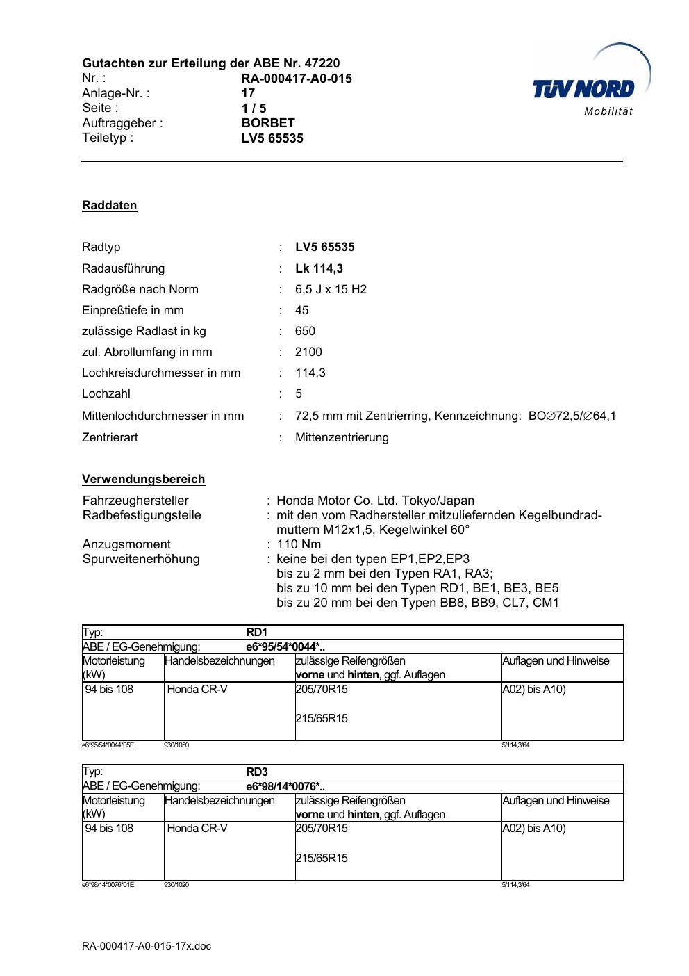 Dieses Gutachten (abe) bezieht sich auf die Alufelge Borbet LV5 65535 in der Ausführung 6.5Jx15 ET 0, Mittenloch 0 mm (KBA 47220). Im PDF findest du typischerweise zulässige Reifengrößen, Auflagen/Anbauhinweise und – je nach Dokument – Hinweise zur Eintragung.