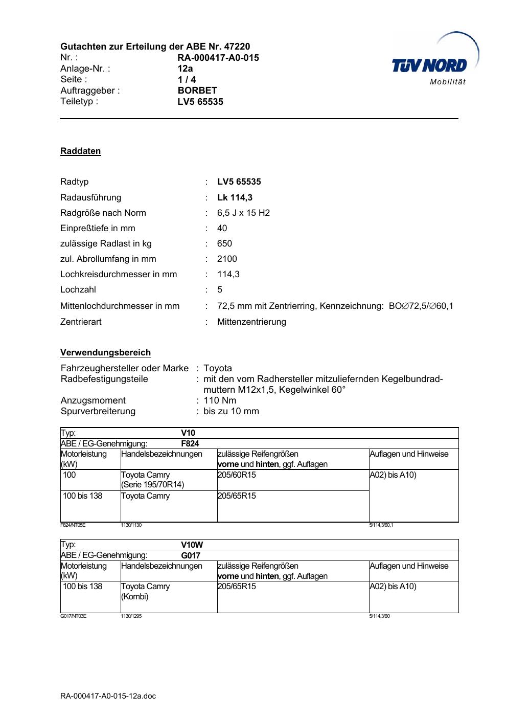 Dieses Gutachten (abe) bezieht sich auf die Alufelge Borbet LV5 65535 in der Ausführung 6.5Jx15 ET 0, Mittenloch 0 mm (KBA 47220). Im PDF findest du typischerweise zulässige Reifengrößen, Auflagen/Anbauhinweise und – je nach Dokument – Hinweise zur Eintragung.