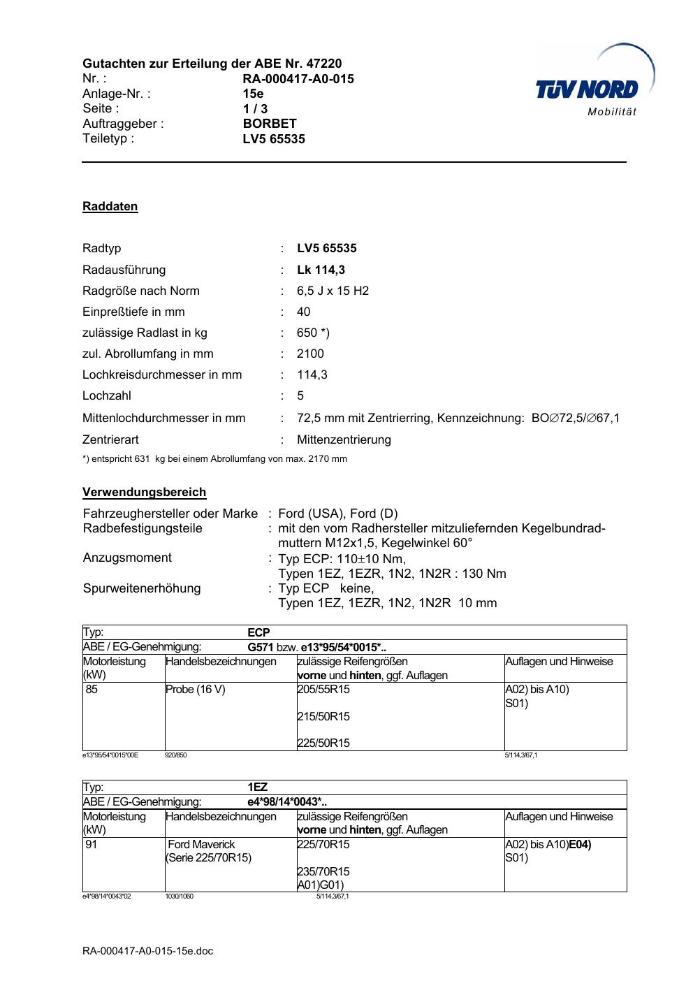 Dieses Gutachten (abe) bezieht sich auf die Alufelge Borbet LV5 65535 in der Ausführung 6.5Jx15 ET 0, Mittenloch 0 mm (KBA 47220). Im PDF findest du typischerweise zulässige Reifengrößen, Auflagen/Anbauhinweise und – je nach Dokument – Hinweise zur Eintragung.