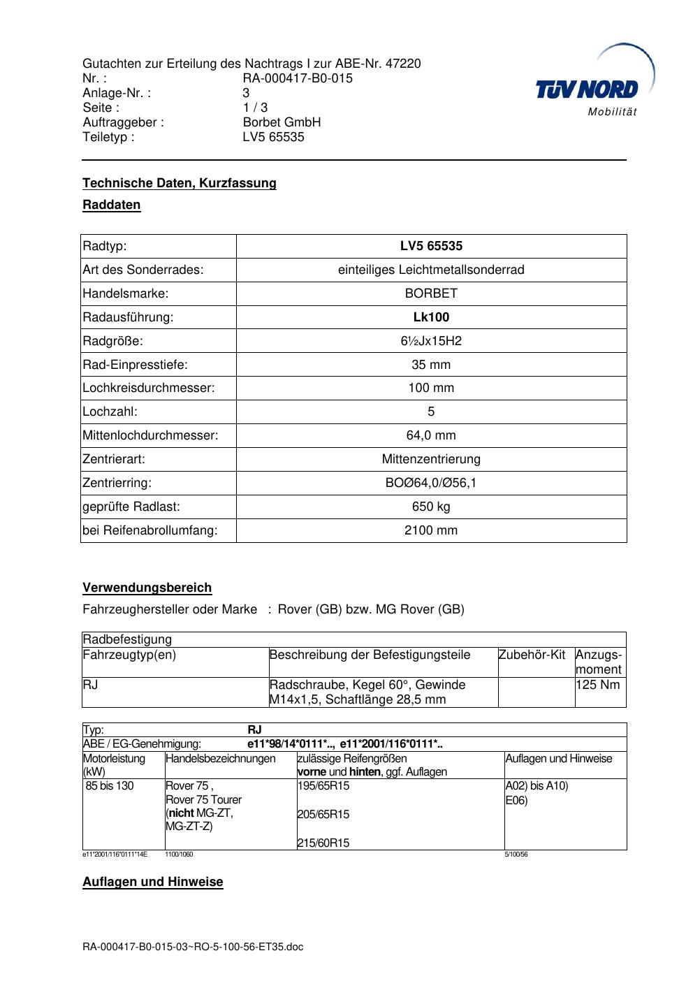 Dieses Gutachten (abe) bezieht sich auf die Alufelge brand-borbet LV5 65535 in der Ausführung ET 0, Mittenloch 0 mm (KBA 47220). Im PDF findest du typischerweise zulässige Reifengrößen, Auflagen/Anbauhinweise und – je nach Dokument – Hinweise zur Eintragung.