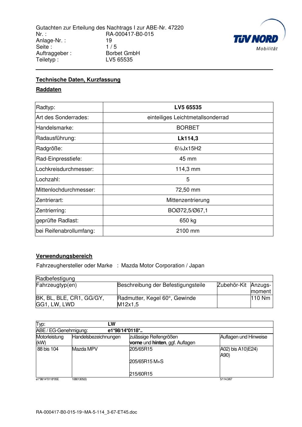 Dieses Gutachten (abe) bezieht sich auf die Alufelge brand-borbet LV5 65535 in der Ausführung ET 0, Mittenloch 0 mm (KBA 47220). Im PDF findest du typischerweise zulässige Reifengrößen, Auflagen/Anbauhinweise und – je nach Dokument – Hinweise zur Eintragung.