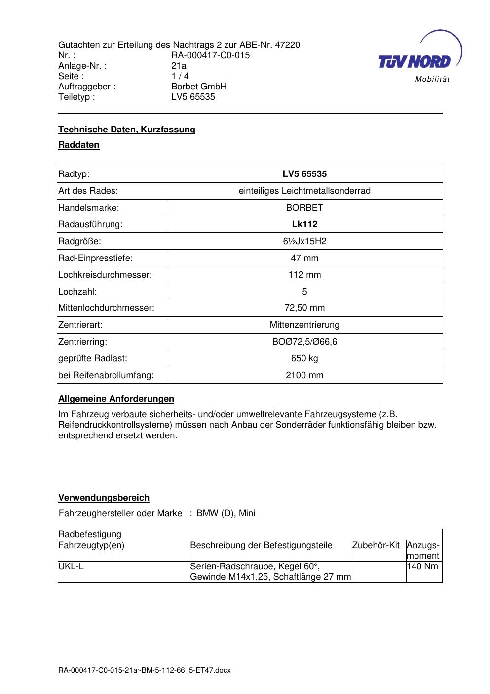 Dieses Gutachten (abe) bezieht sich auf die Alufelge brand-borbet LV5 65535 in der Ausführung ET 0, Mittenloch 0 mm (KBA 47220). Im PDF findest du typischerweise zulässige Reifengrößen, Auflagen/Anbauhinweise und – je nach Dokument – Hinweise zur Eintragung.