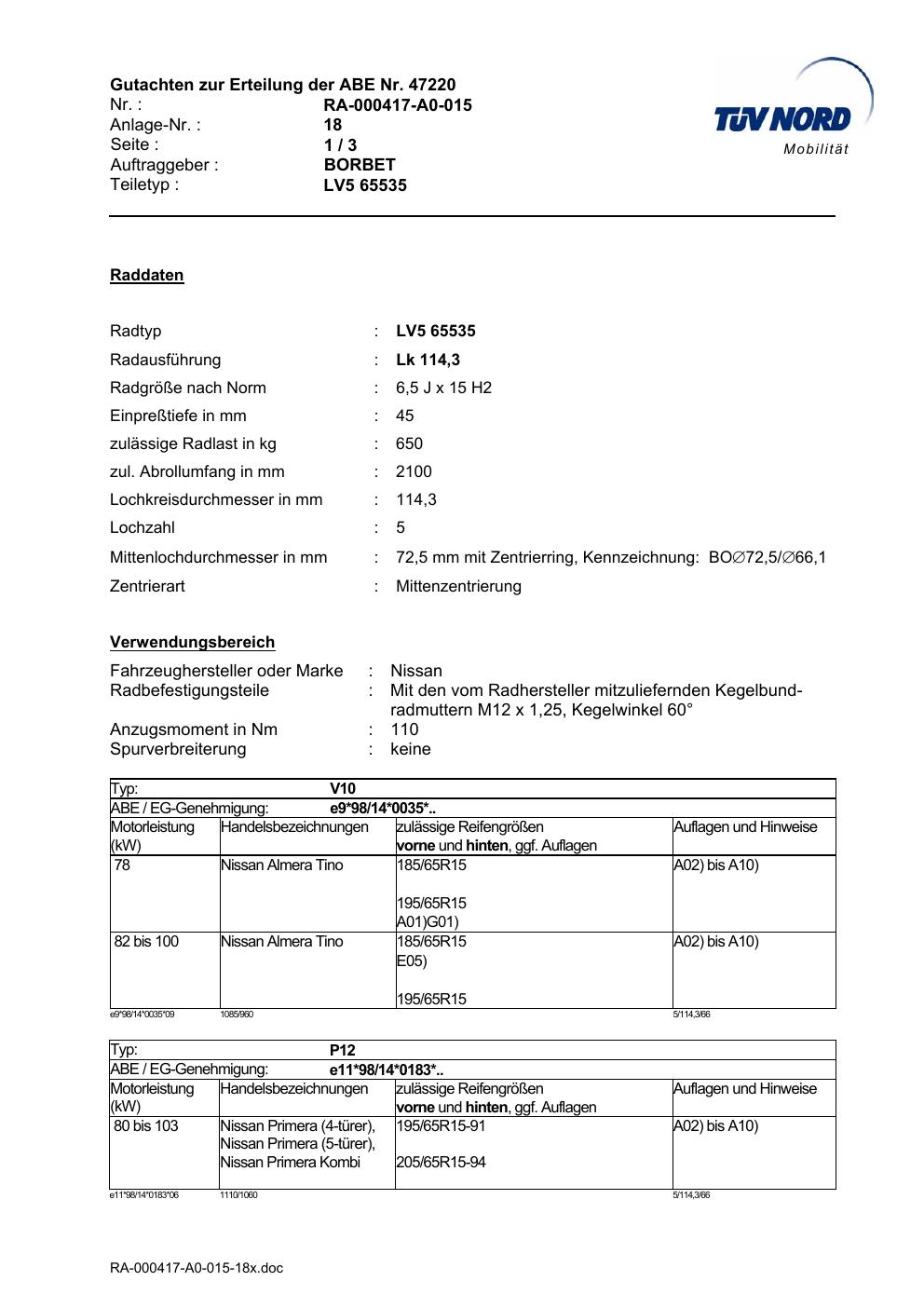 Dieses Gutachten (abe) bezieht sich auf die Alufelge Borbet LV5 65535 in der Ausführung 6.5Jx15 ET 0, Mittenloch 0 mm (KBA 47220). Im PDF findest du typischerweise zulässige Reifengrößen, Auflagen/Anbauhinweise und – je nach Dokument – Hinweise zur Eintragung.