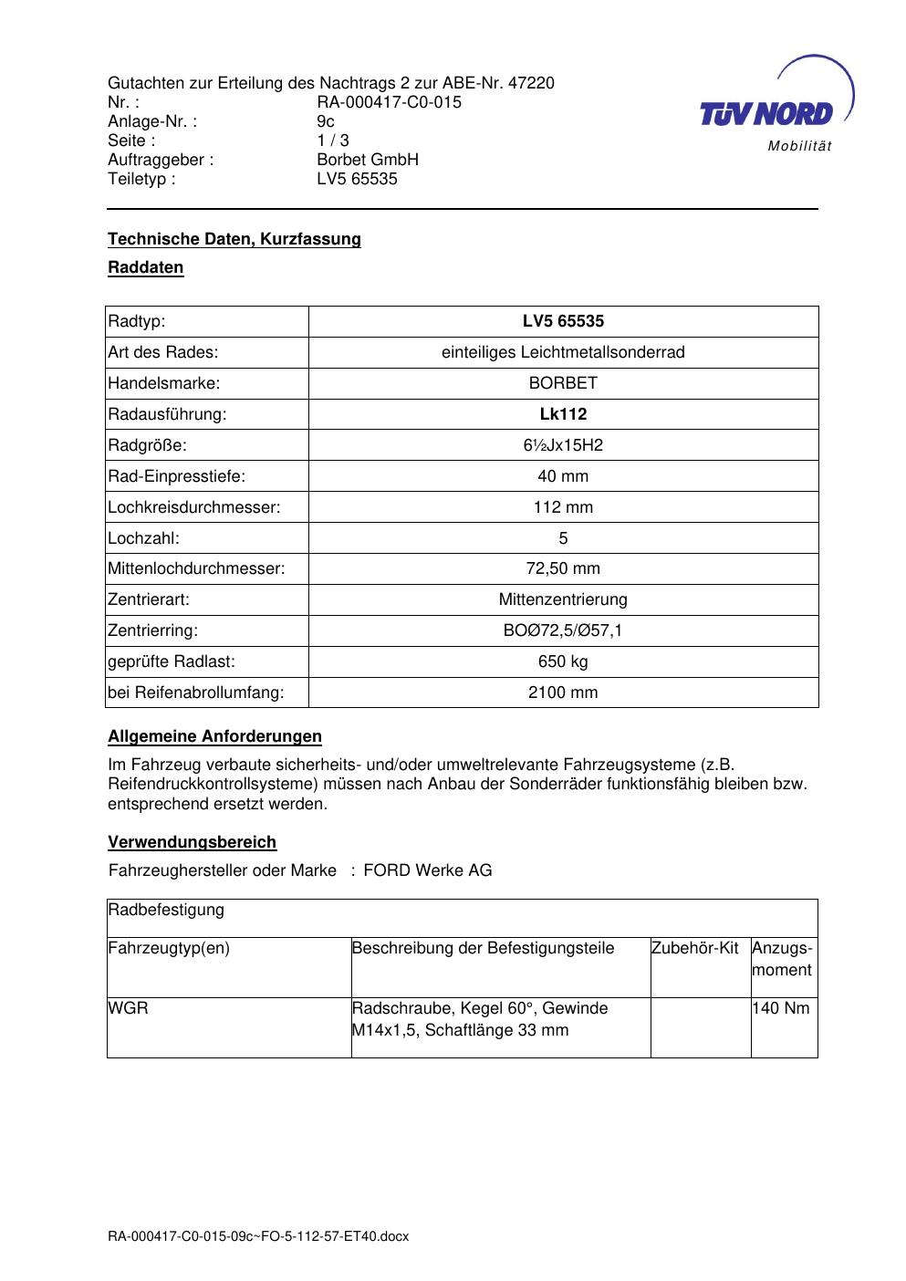Dieses Gutachten (abe) bezieht sich auf die Alufelge brand-borbet LV5 65535 in der Ausführung ET 0, Mittenloch 0 mm (KBA 47220). Im PDF findest du typischerweise zulässige Reifengrößen, Auflagen/Anbauhinweise und – je nach Dokument – Hinweise zur Eintragung.