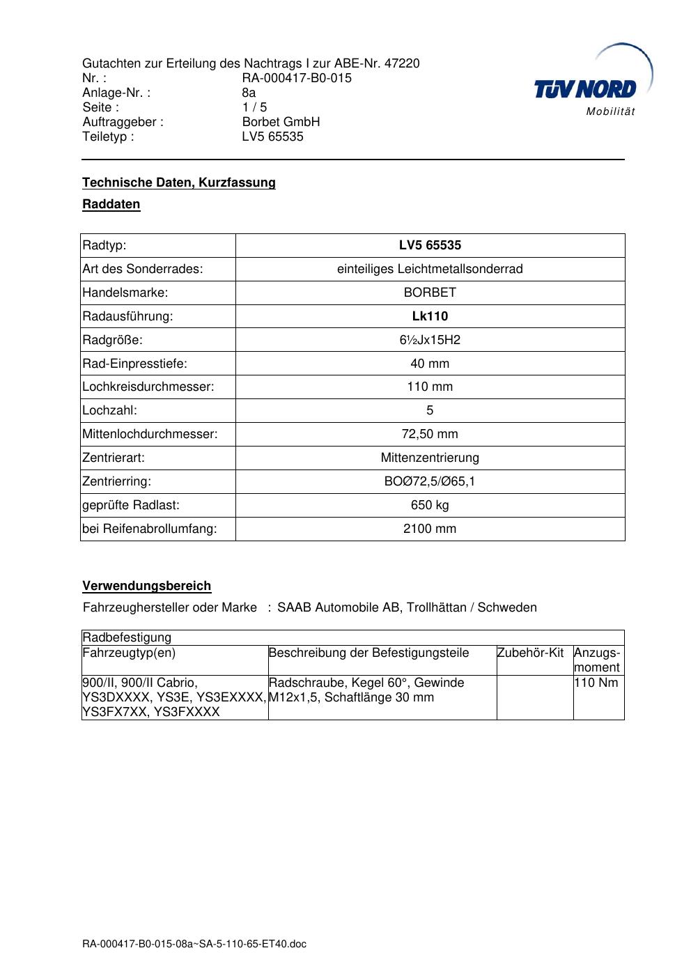 Dieses Gutachten (abe) bezieht sich auf die Alufelge brand-borbet LV5 65535 in der Ausführung ET 0, Mittenloch 0 mm (KBA 47220). Im PDF findest du typischerweise zulässige Reifengrößen, Auflagen/Anbauhinweise und – je nach Dokument – Hinweise zur Eintragung.