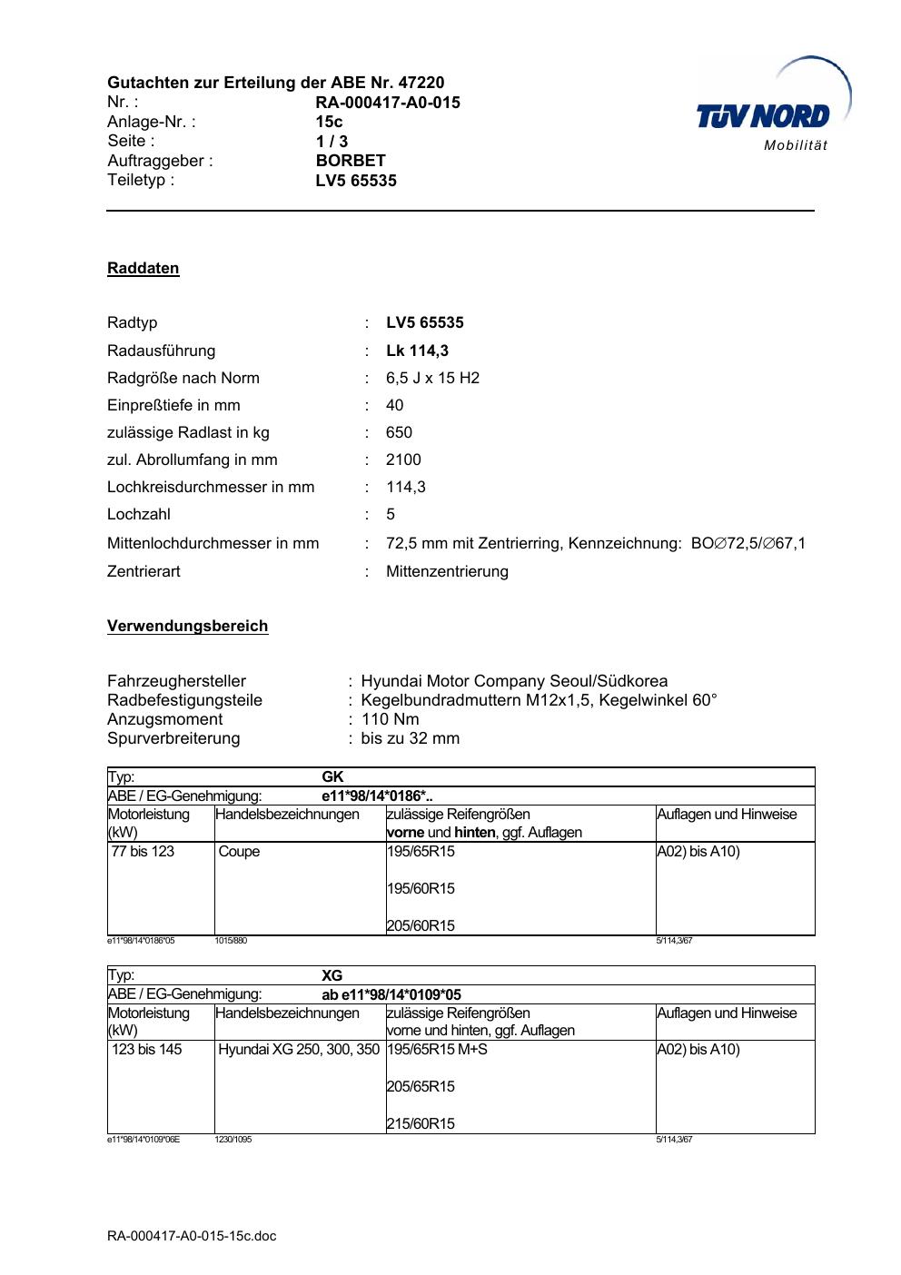 Dieses Gutachten (abe) bezieht sich auf die Alufelge Borbet LV5 65535 in der Ausführung 6.5Jx15 ET 0, Mittenloch 0 mm (KBA 47220). Im PDF findest du typischerweise zulässige Reifengrößen, Auflagen/Anbauhinweise und – je nach Dokument – Hinweise zur Eintragung.
