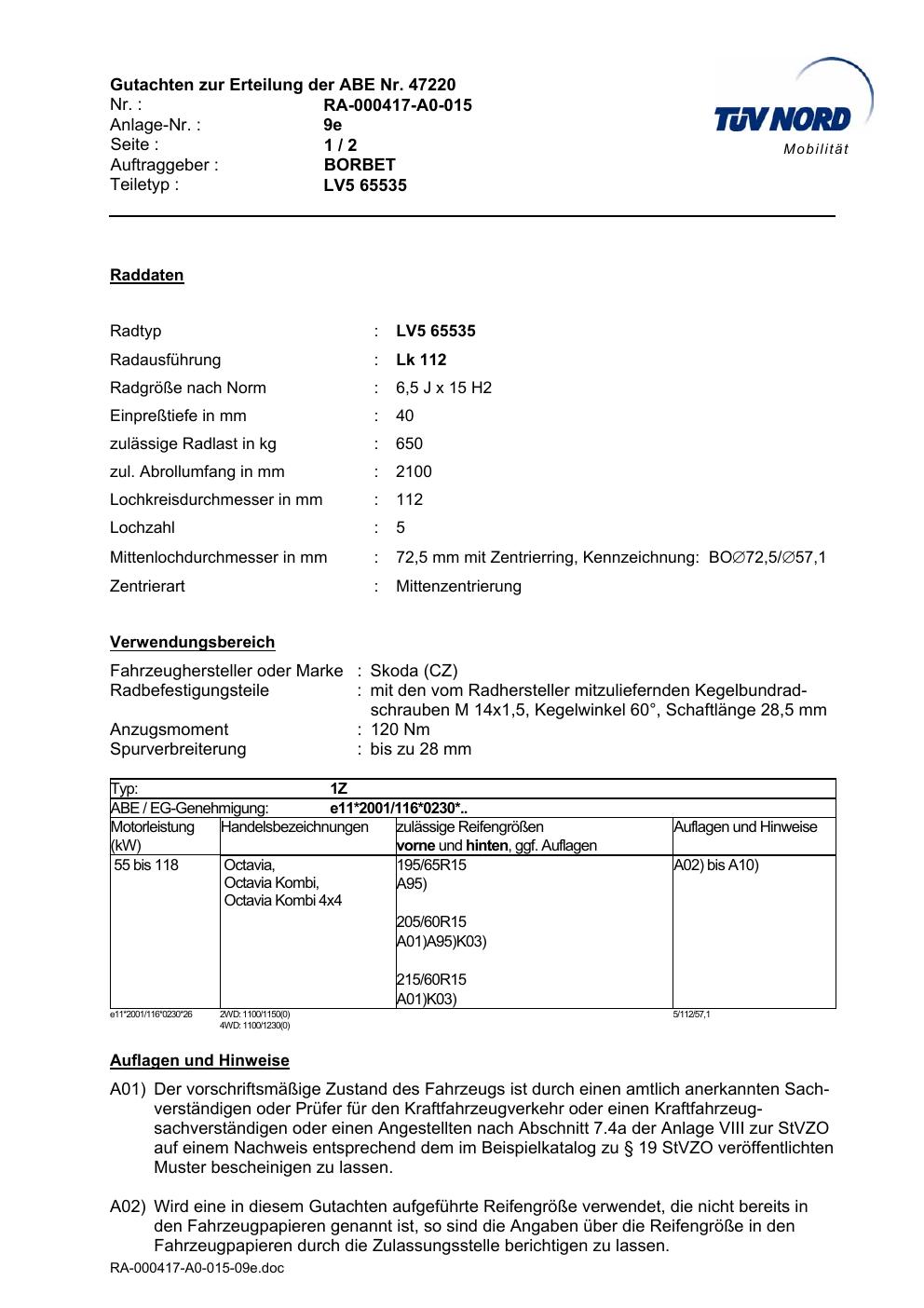 Dieses Gutachten (abe) bezieht sich auf die Alufelge Borbet LV5 65535 in der Ausführung 6.5Jx15 ET 0, Mittenloch 0 mm (KBA 47220). Im PDF findest du typischerweise zulässige Reifengrößen, Auflagen/Anbauhinweise und – je nach Dokument – Hinweise zur Eintragung.