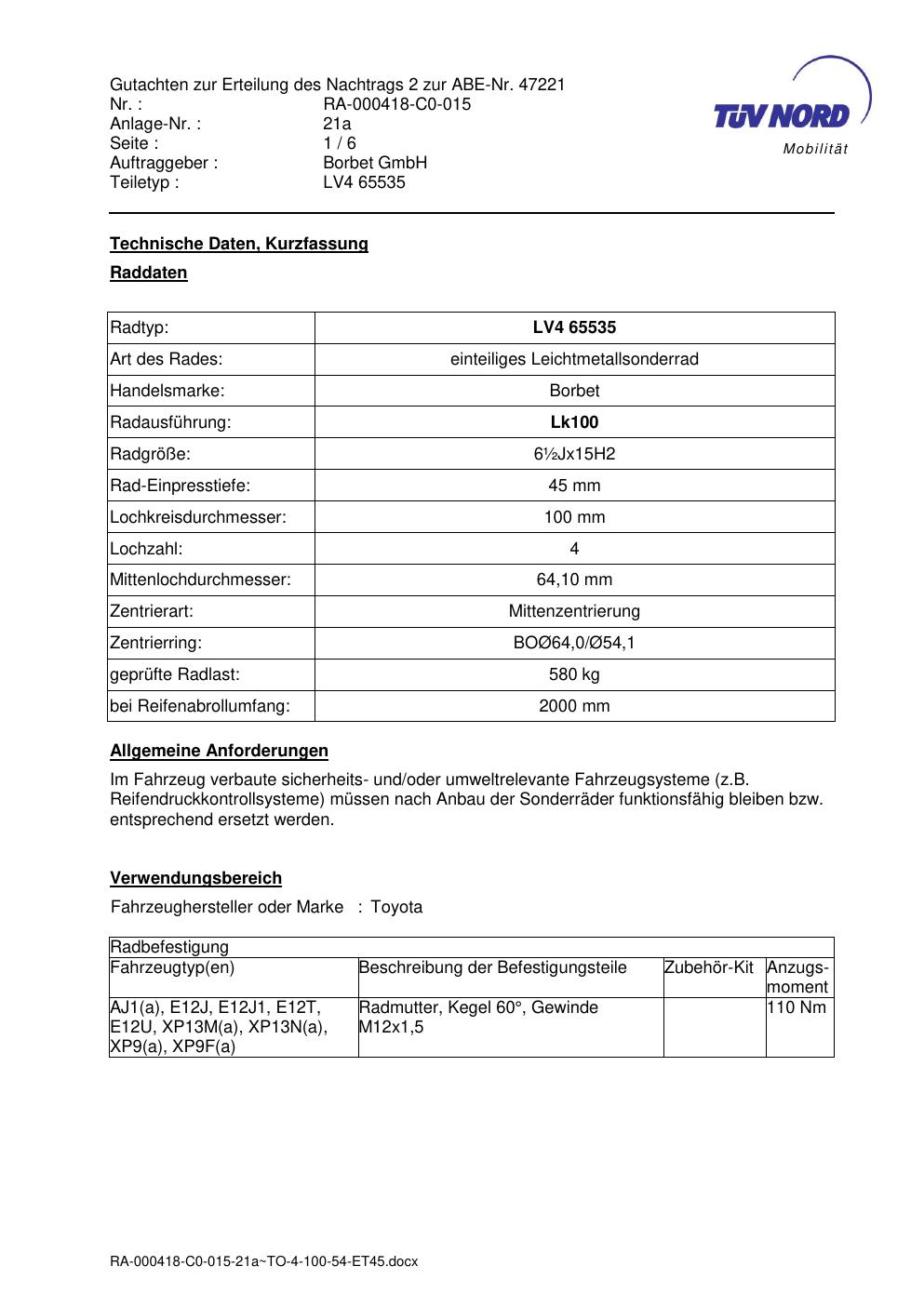 Dieses Gutachten (abe) bezieht sich auf die Alufelge ATS LV4 65535 in der Ausführung ET 0, Mittenloch 0 mm (KBA 47221). Im PDF findest du typischerweise zulässige Reifengrößen, Auflagen/Anbauhinweise und – je nach Dokument – Hinweise zur Eintragung.