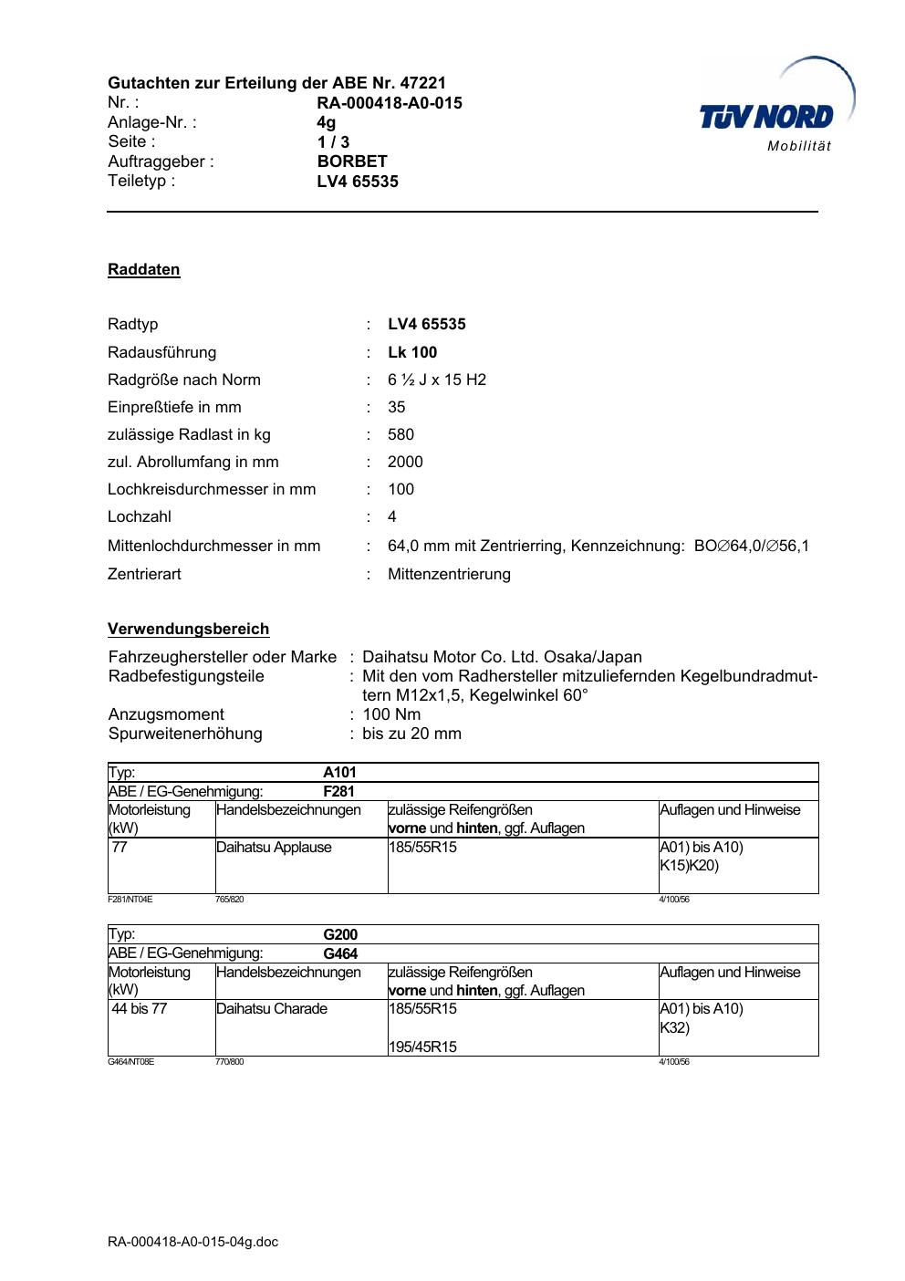 Diese Allgemeine Betriebserlaubnis (ABE) bezieht sich auf die Felge
