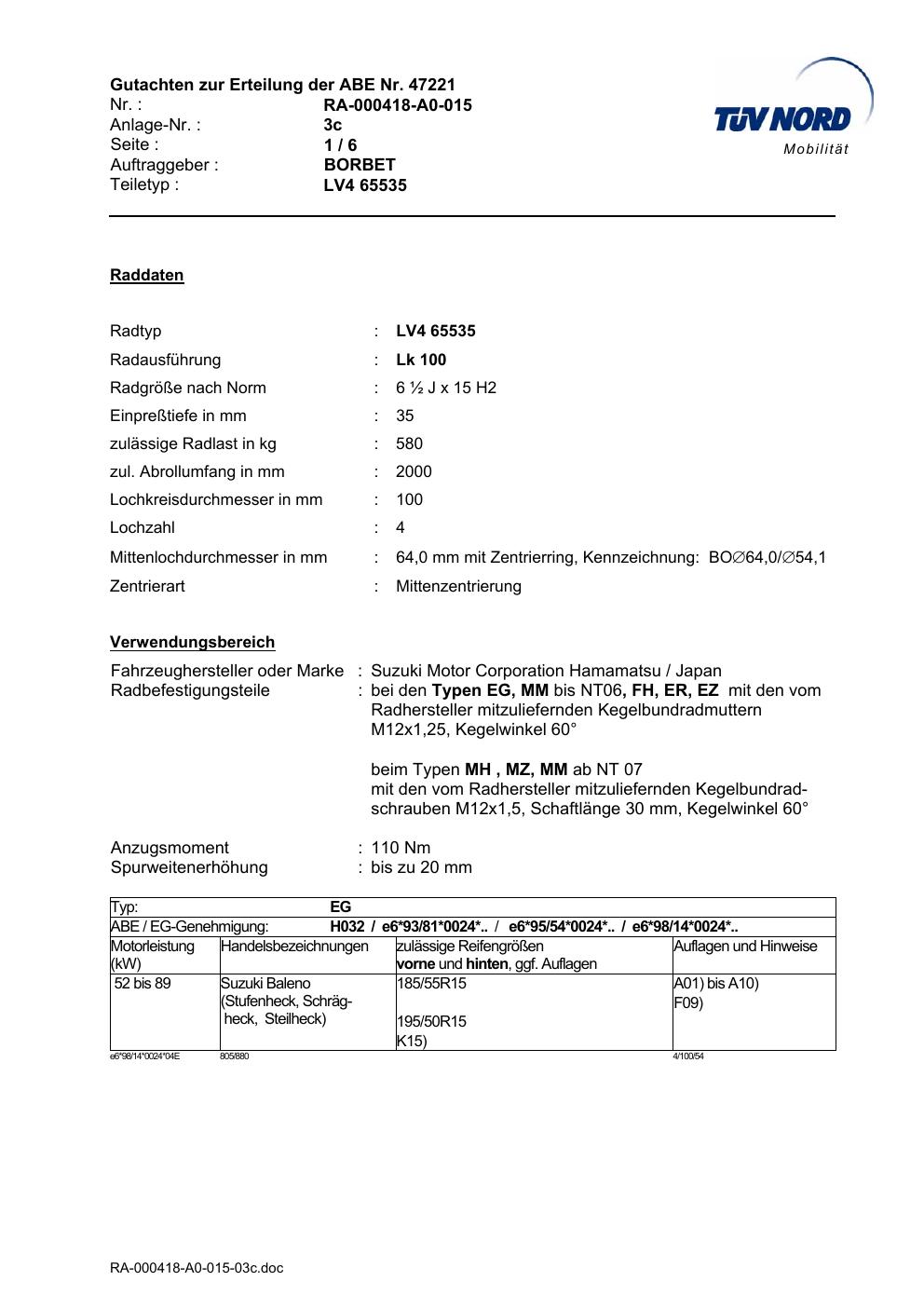 Diese Allgemeine Betriebserlaubnis (ABE) bezieht sich auf die Felge