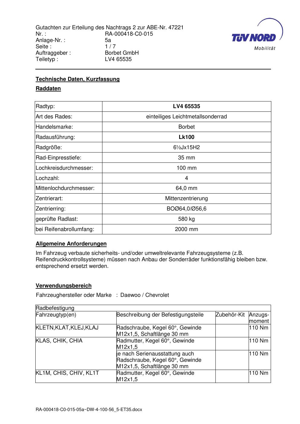 Dieses Gutachten (abe) bezieht sich auf die Alufelge Borbet LV4 65535 in der Ausführung ET 0, Mittenloch 0 mm (KBA 47221). Im PDF findest du typischerweise zulässige Reifengrößen, Auflagen/Anbauhinweise und – je nach Dokument – Hinweise zur Eintragung.