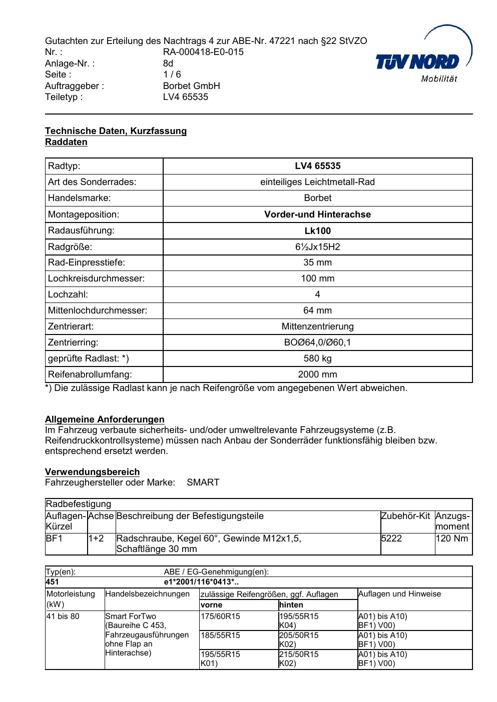 Dieses Gutachten (abe) bezieht sich auf die Alufelge Borbet LV4 65535 in der Ausführung ET 0, Mittenloch 0 mm (KBA 47221). Im PDF findest du typischerweise zulässige Reifengrößen, Auflagen/Anbauhinweise und – je nach Dokument – Hinweise zur Eintragung.