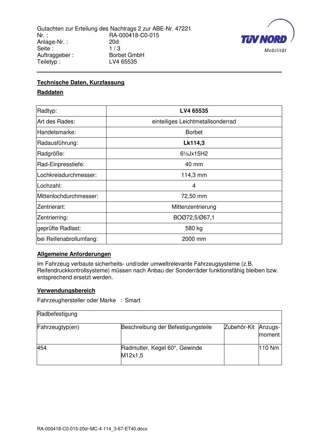 Dieses Gutachten (abe) bezieht sich auf die Alufelge Borbet LV4 65535 in der Ausführung ET 0, Mittenloch 0 mm (KBA 47221). Im PDF findest du typischerweise zulässige Reifengrößen, Auflagen/Anbauhinweise und – je nach Dokument – Hinweise zur Eintragung.
