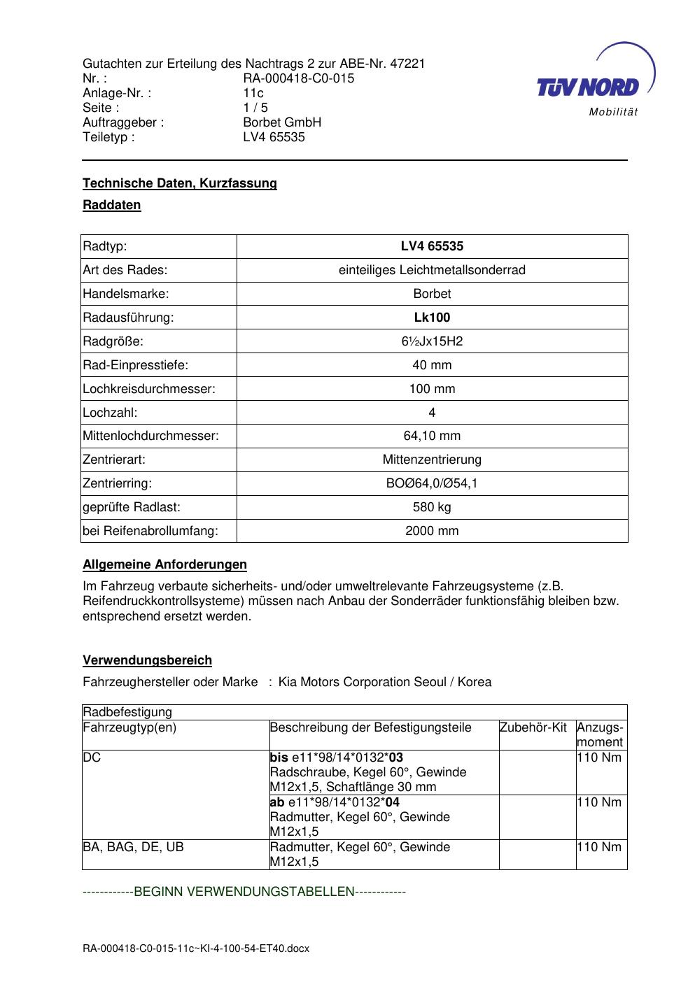 Dieses Gutachten (abe) bezieht sich auf die Alufelge Borbet LV4 65535 in der Ausführung ET 0, Mittenloch 0 mm (KBA 47221). Im PDF findest du typischerweise zulässige Reifengrößen, Auflagen/Anbauhinweise und – je nach Dokument – Hinweise zur Eintragung.