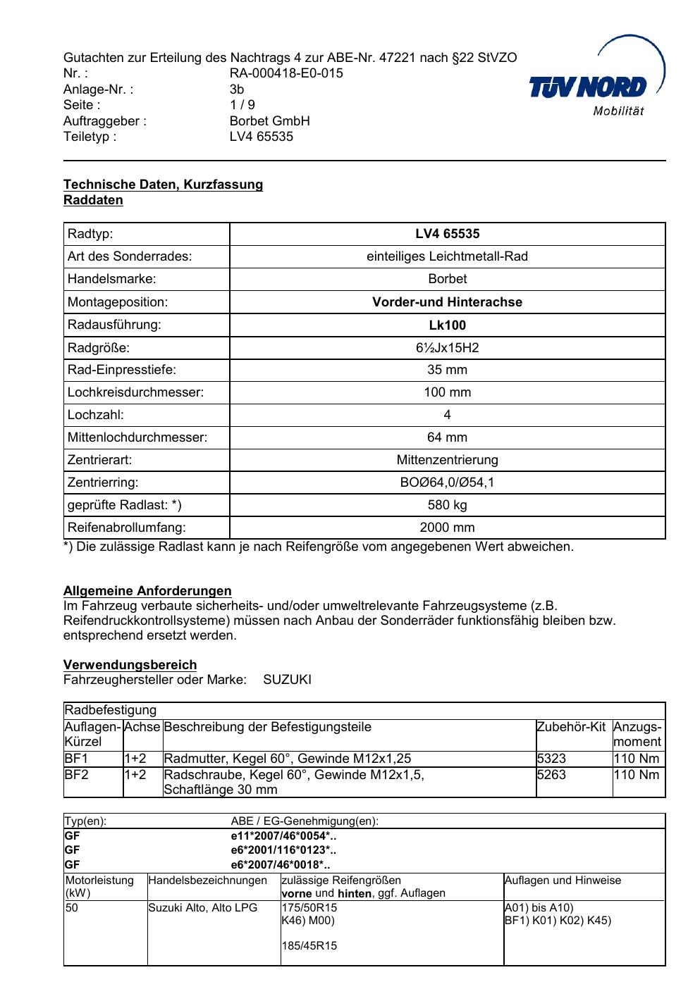 Dieses Gutachten (abe) bezieht sich auf die Alufelge Borbet LV4 65535 in der Ausführung ET 0, Mittenloch 0 mm (KBA 47221). Im PDF findest du typischerweise zulässige Reifengrößen, Auflagen/Anbauhinweise und – je nach Dokument – Hinweise zur Eintragung.