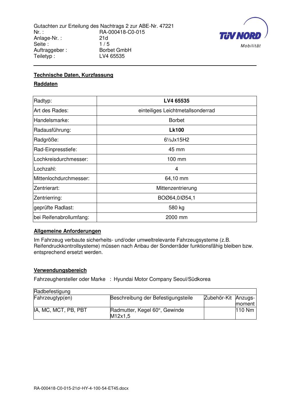 Dieses Gutachten (abe) bezieht sich auf die Alufelge Borbet LV4 65535 in der Ausführung ET 0, Mittenloch 0 mm (KBA 47221). Im PDF findest du typischerweise zulässige Reifengrößen, Auflagen/Anbauhinweise und – je nach Dokument – Hinweise zur Eintragung.