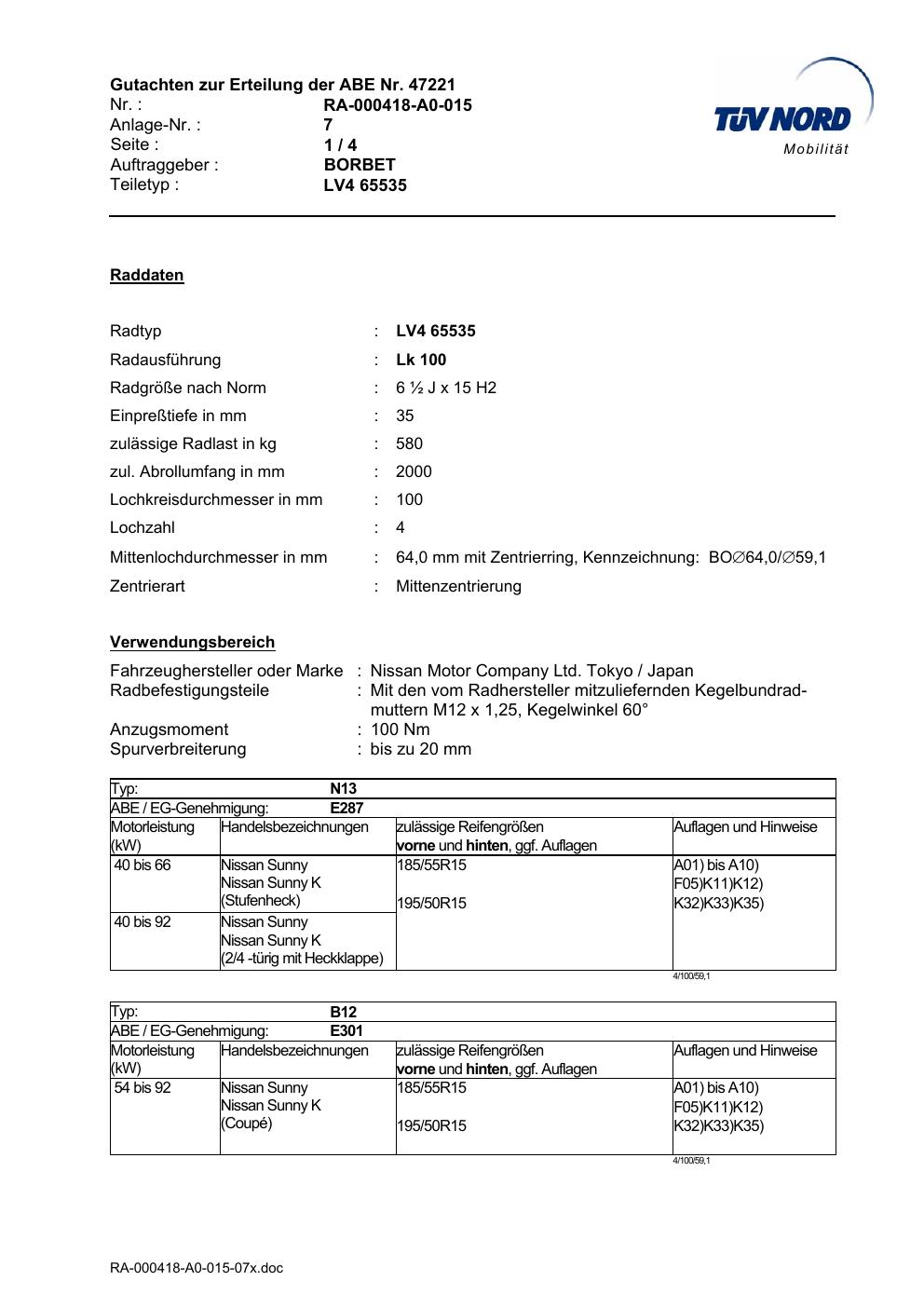 Dieses Gutachten (abe) bezieht sich auf die Alufelge Borbet LV4 65535 in der Ausführung ET 0, Mittenloch 0 mm (KBA 47221). Im PDF findest du typischerweise zulässige Reifengrößen, Auflagen/Anbauhinweise und – je nach Dokument – Hinweise zur Eintragung.