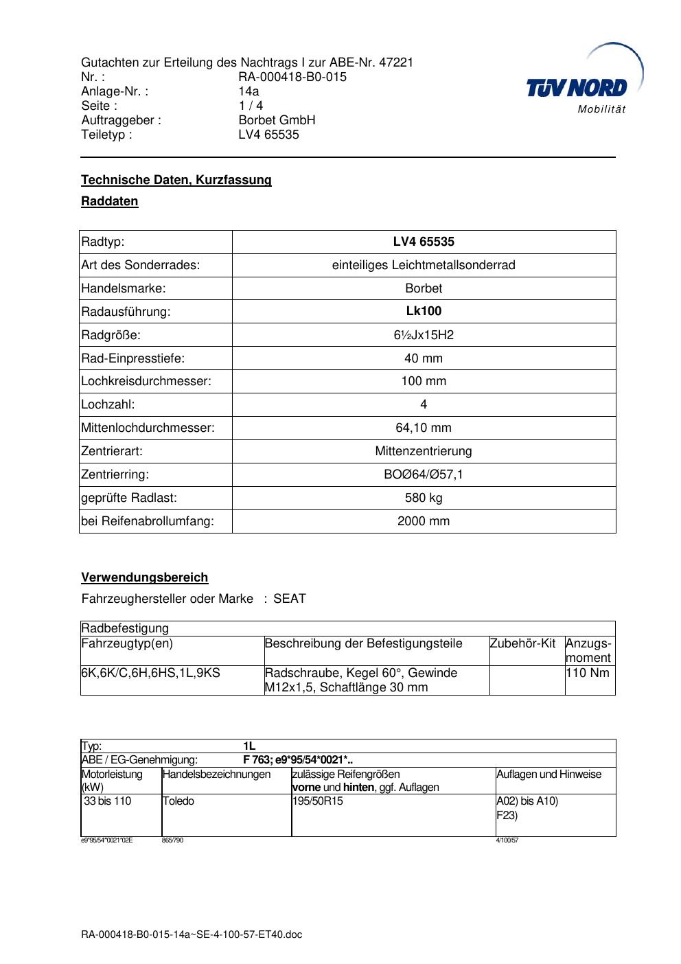 Dieses Gutachten (abe) bezieht sich auf die Alufelge Borbet LV4 65535 in der Ausführung ET 0, Mittenloch 0 mm (KBA 47221). Im PDF findest du typischerweise zulässige Reifengrößen, Auflagen/Anbauhinweise und – je nach Dokument – Hinweise zur Eintragung.