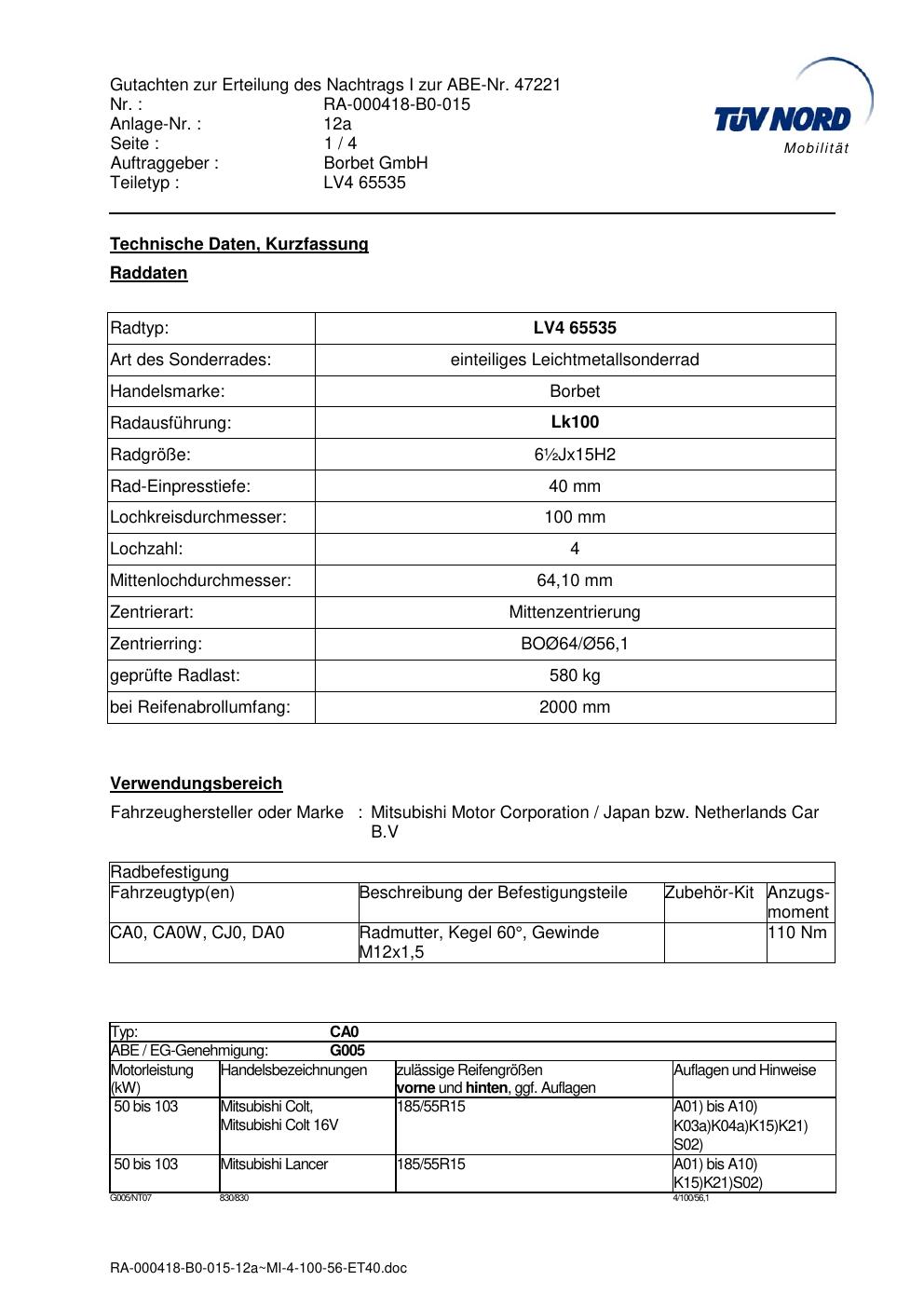 Dieses Gutachten (abe) bezieht sich auf die Alufelge Borbet LV4 65535 in der Ausführung ET 0, Mittenloch 0 mm (KBA 47221). Im PDF findest du typischerweise zulässige Reifengrößen, Auflagen/Anbauhinweise und – je nach Dokument – Hinweise zur Eintragung.