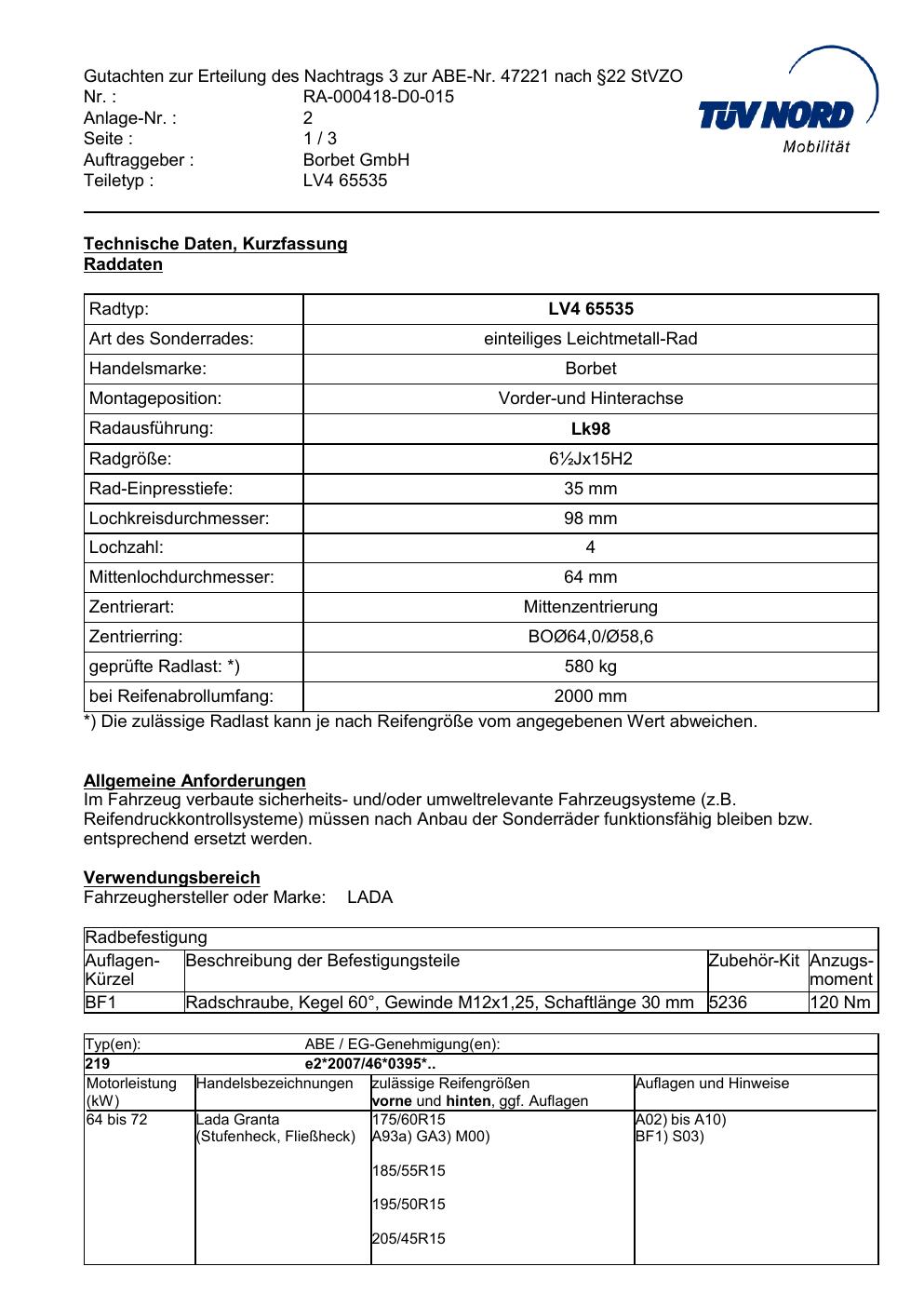 Dieses Gutachten (abe) bezieht sich auf die Alufelge Borbet LV4 65535 in der Ausführung ET 0, Mittenloch 0 mm (KBA 47221). Im PDF findest du typischerweise zulässige Reifengrößen, Auflagen/Anbauhinweise und – je nach Dokument – Hinweise zur Eintragung.