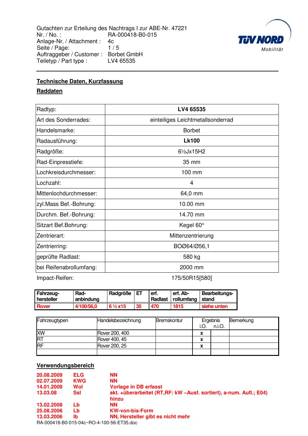 Dieses Gutachten (abe) bezieht sich auf die Alufelge Borbet LV4 65535 in der Ausführung 7Jx15 ET 0, Mittenloch 0 mm (KBA 47221). Im PDF findest du typischerweise zulässige Reifengrößen, Auflagen/Anbauhinweise und – je nach Dokument – Hinweise zur Eintragung.