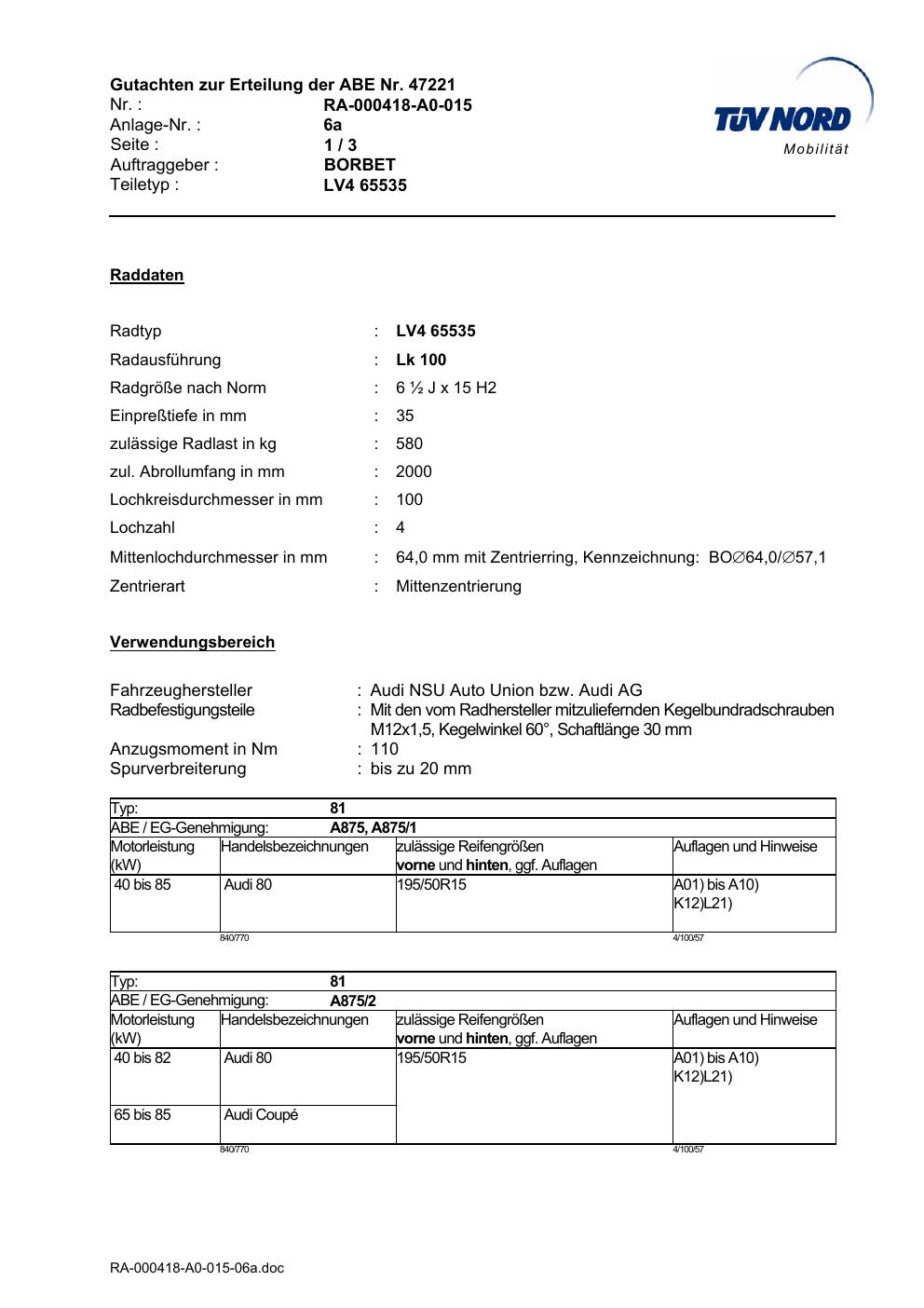 Dieses Gutachten (abe) bezieht sich auf die Alufelge Borbet LV4 65535 in der Ausführung ET 0, Mittenloch 0 mm (KBA 47221). Im PDF findest du typischerweise zulässige Reifengrößen, Auflagen/Anbauhinweise und – je nach Dokument – Hinweise zur Eintragung.