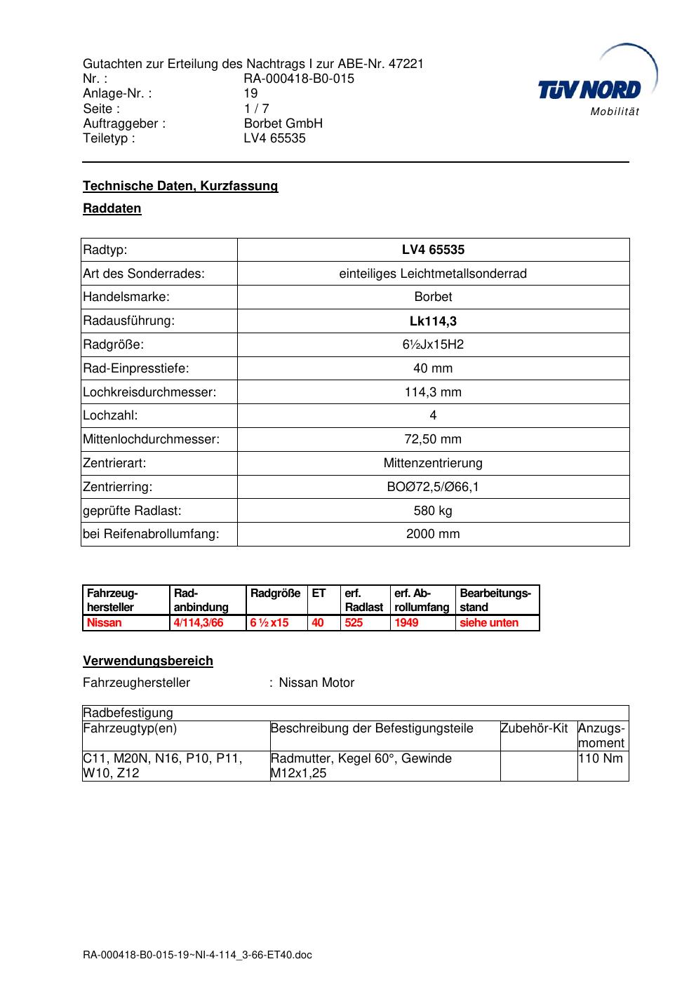 Dieses Gutachten (abe) bezieht sich auf die Alufelge Borbet LV4 65535 in der Ausführung ET 0, Mittenloch 0 mm (KBA 47221). Im PDF findest du typischerweise zulässige Reifengrößen, Auflagen/Anbauhinweise und – je nach Dokument – Hinweise zur Eintragung.