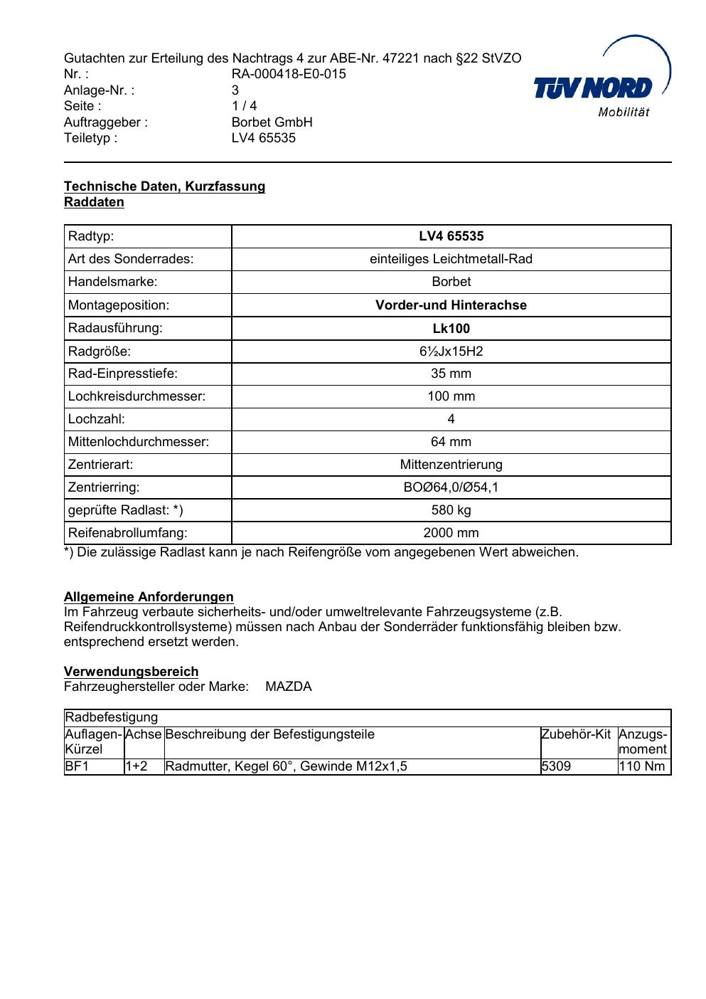 Dieses Gutachten (abe) bezieht sich auf die Alufelge Borbet LV4 65535 in der Ausführung ET 0, Mittenloch 0 mm (KBA 47221). Im PDF findest du typischerweise zulässige Reifengrößen, Auflagen/Anbauhinweise und – je nach Dokument – Hinweise zur Eintragung.
