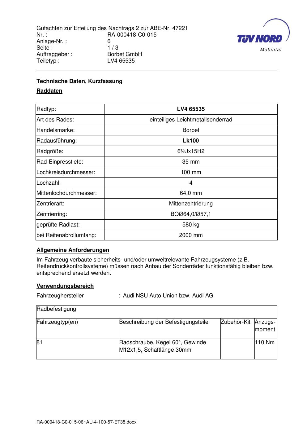 Dieses Gutachten (abe) bezieht sich auf die Alufelge Borbet LV4 65535 in der Ausführung ET 0, Mittenloch 0 mm (KBA 47221). Im PDF findest du typischerweise zulässige Reifengrößen, Auflagen/Anbauhinweise und – je nach Dokument – Hinweise zur Eintragung.