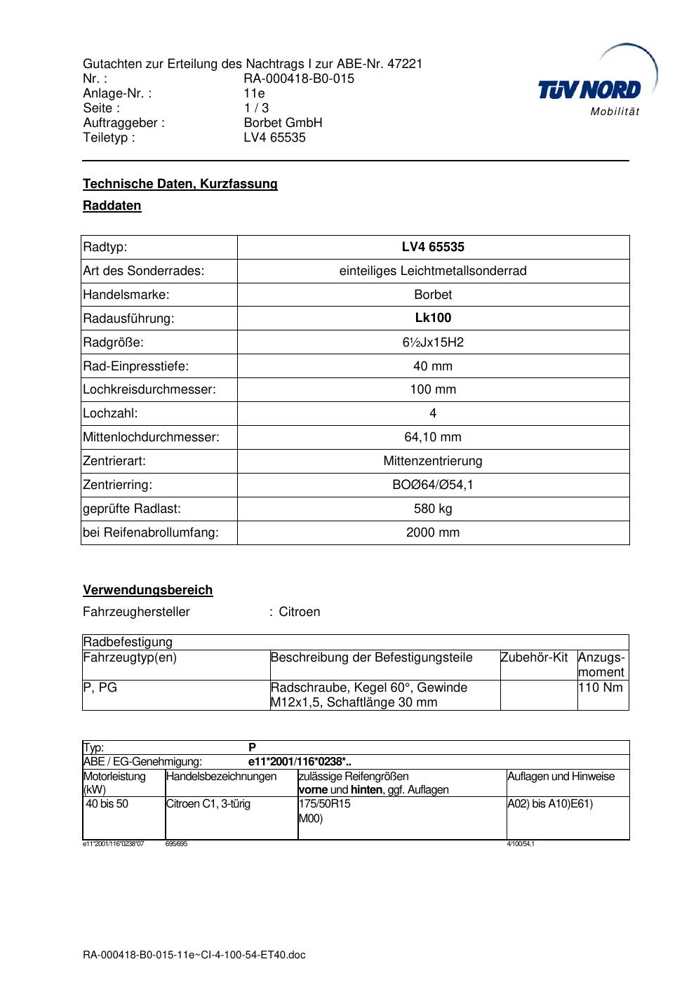 Dieses Gutachten (abe) bezieht sich auf die Alufelge Borbet LV4 65535 in der Ausführung ET 0, Mittenloch 0 mm (KBA 47221). Im PDF findest du typischerweise zulässige Reifengrößen, Auflagen/Anbauhinweise und – je nach Dokument – Hinweise zur Eintragung.