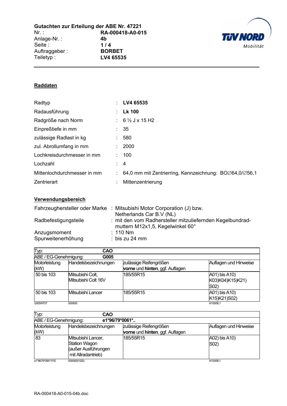 Dieses Gutachten (abe) bezieht sich auf die Alufelge Borbet LV4 65535 in der Ausführung ET 0, Mittenloch 0 mm (KBA 47221). Im PDF findest du typischerweise zulässige Reifengrößen, Auflagen/Anbauhinweise und – je nach Dokument – Hinweise zur Eintragung.