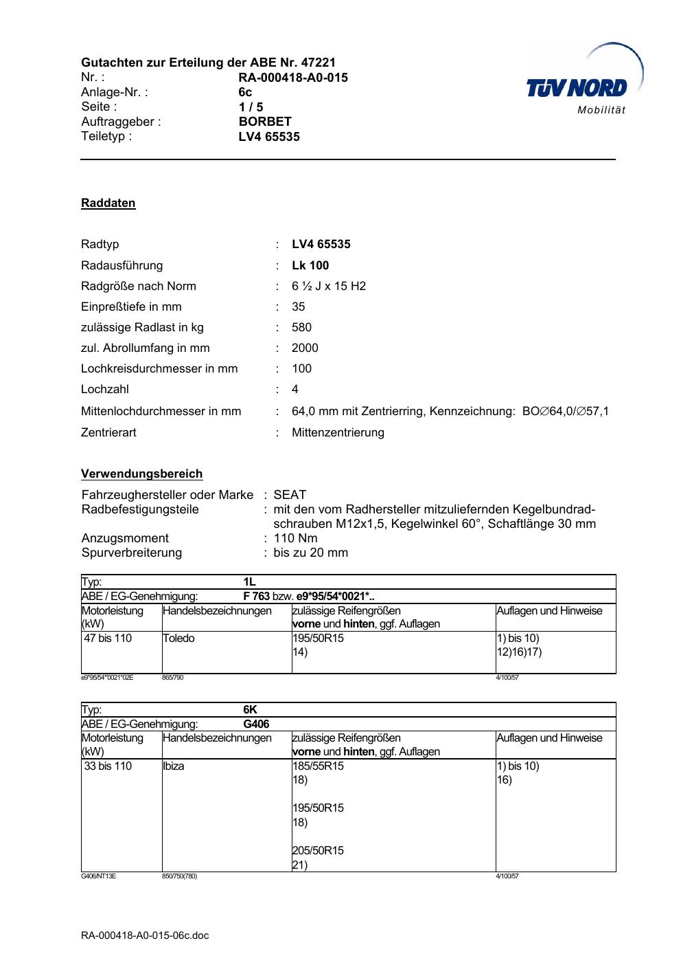 Dieses Gutachten (abe) bezieht sich auf die Alufelge Borbet LV4 65535 in der Ausführung ET 0, Mittenloch 0 mm (KBA 47221). Im PDF findest du typischerweise zulässige Reifengrößen, Auflagen/Anbauhinweise und – je nach Dokument – Hinweise zur Eintragung.